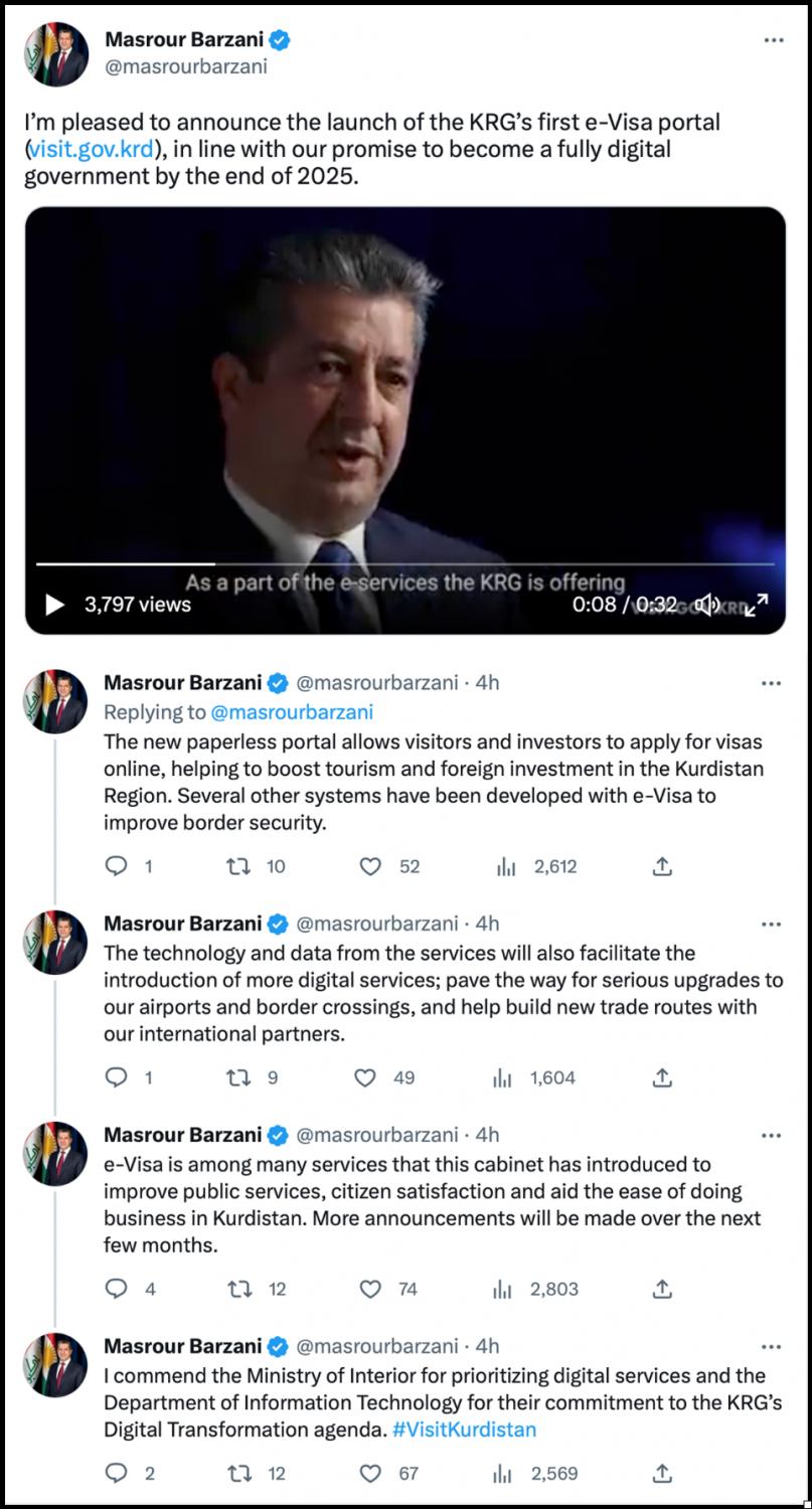 “I’m pleased to announce the launch of the KRG’s first e-Visa portal (http://visit.gov.krd), in line with our promise to become a fully digital government by the end of 2025,” PM Barzani wrote on Twitter.