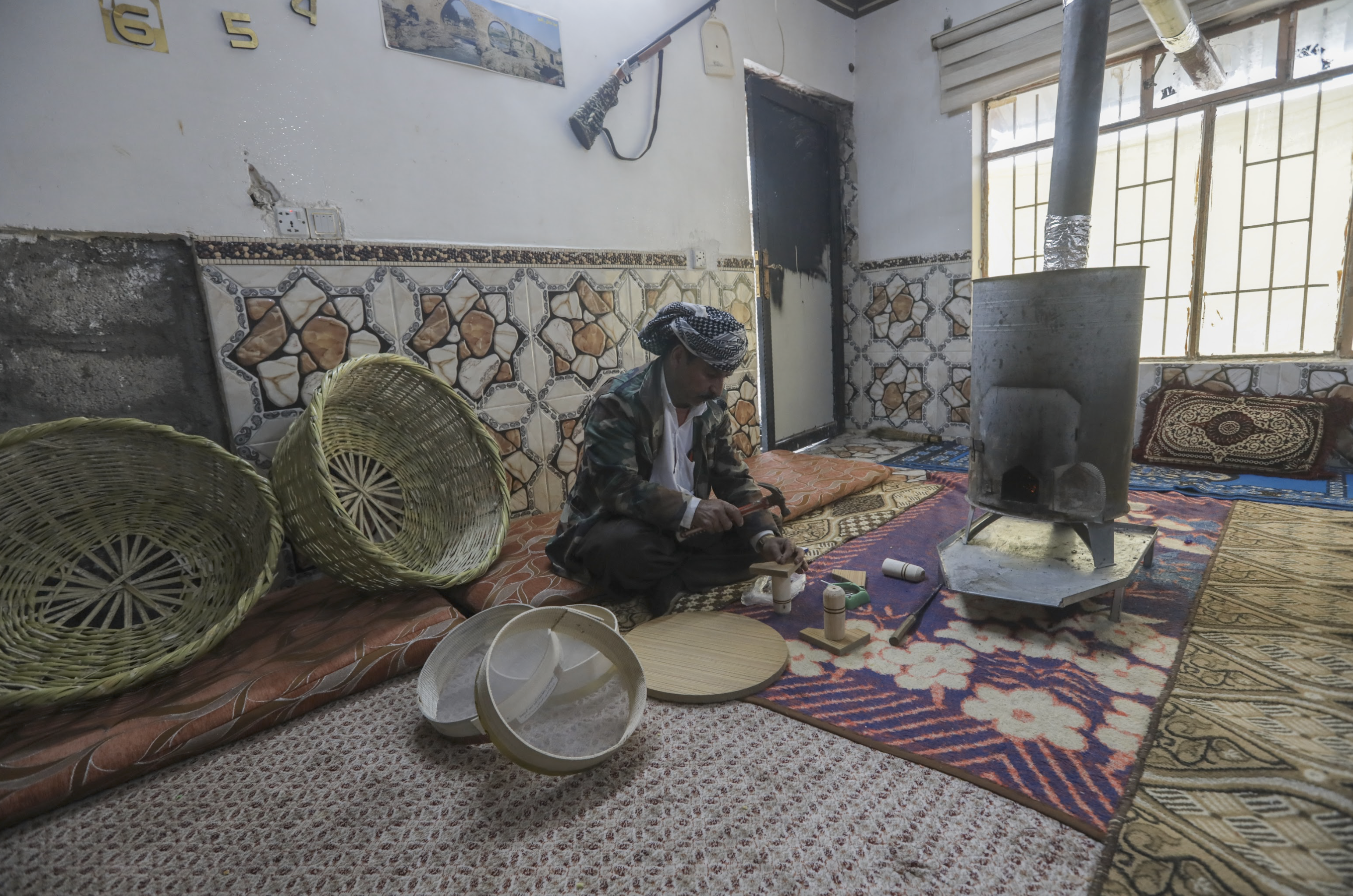 In Rizgari village, located north of Duhok, where approximately 500 Dom families reside, Jaafar Mustafa sat beside a wood stove at his home making flour and wheat sieves. He planned to sell them in other villages and at the Duhok bazaar. Jaafar has been involved in this craft since childhood, when he learned it from his father, who had inherited it from his own father before him. Jaafar’s two sons have also followed suit by learning this craft from their father with intentions to pass it down to future generations.
