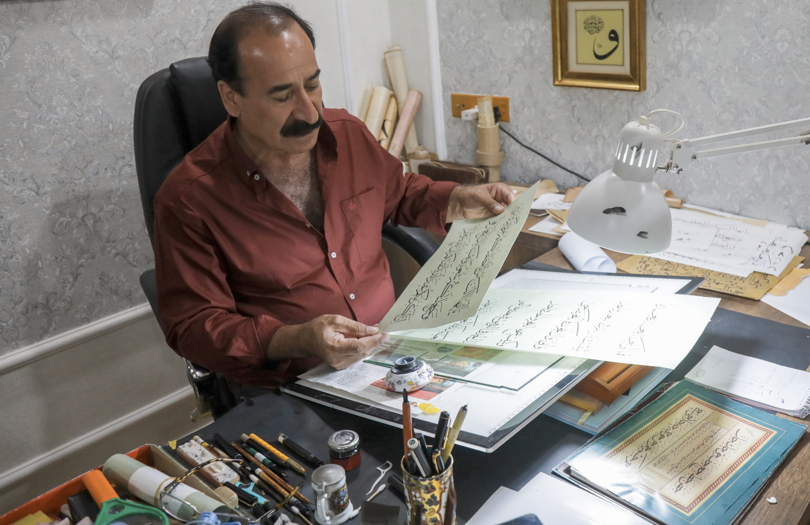 In his studio on the outskirts of Erbil, master calligrapher Bjar Erbili is surrounded by the warm glow of creativity. He dips his delicate broad-edged nib and brushes in ink, his movements filled with the quiet focus of a man possessed by his passion. The room is a witness to his talent, adorned with samples of his work, such as beautifully written gold-painted verses of the Quran and poems by notable Kurdish and Arab poets. A single copy of the Quran holds a special place in the center of the room, on a big table; it is a copy of the Quran that Bjar wrote for Sheikh Khalifa bin Zayed Al Nahyan, the former president of the UAE.