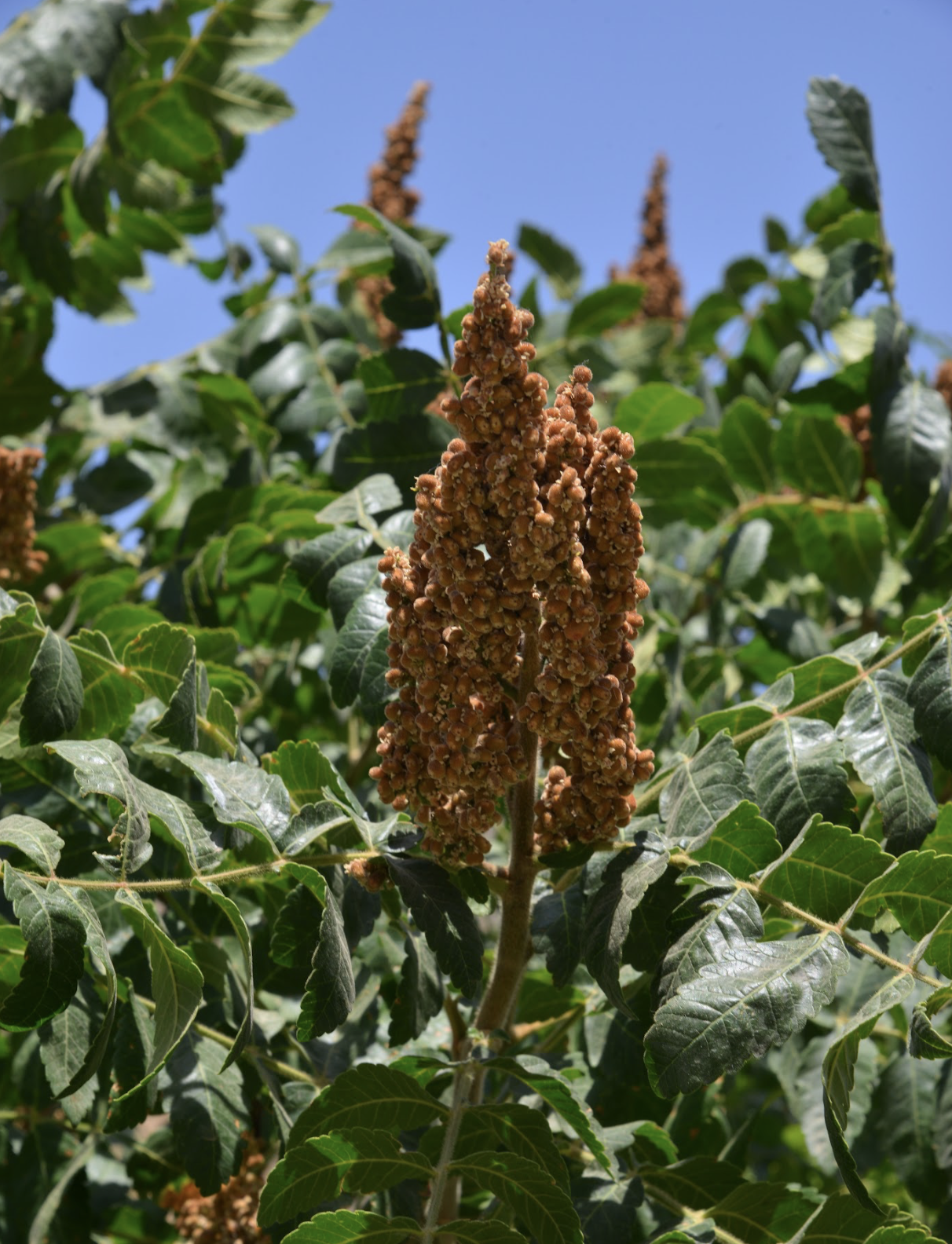 Goats are a traditional and effective form of control for sumac, since they consume the plants’ bark and inhibit the growth of new branches. Mowing, however, is less effective, given the elasticity of sumac wood. Sumac can quickly regrow following cutting, and spreads via rhizomes, creating clonal colonies from a central mature tree. Root trimming is one way to control the plant’s growth without completely eradicating it.
