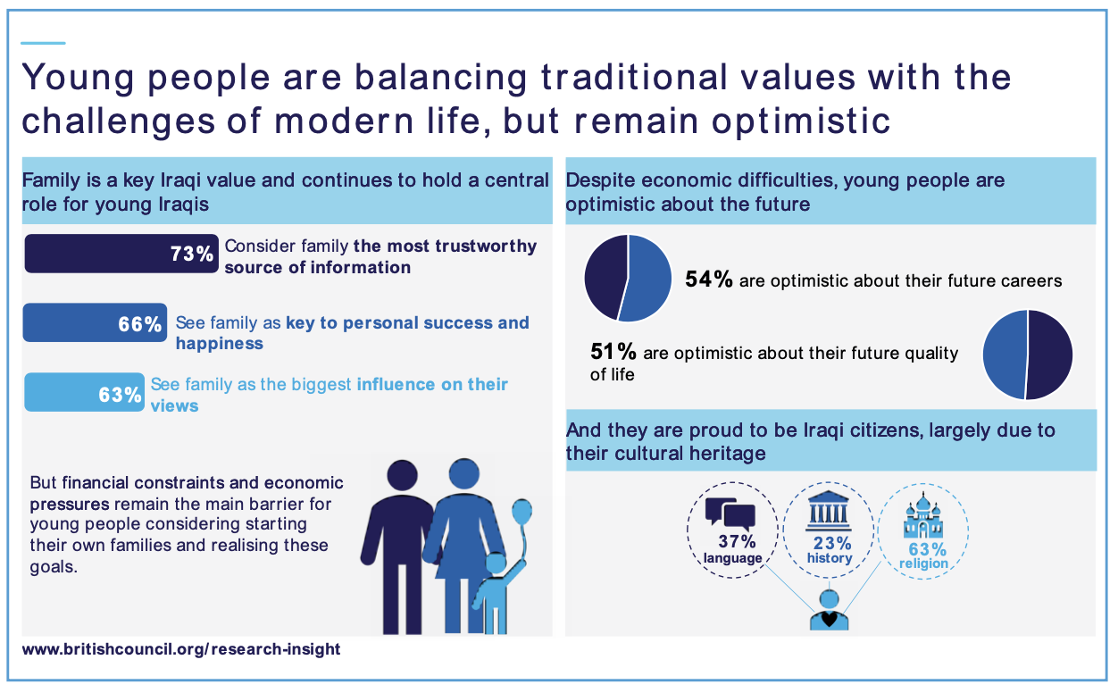 Balancing traditional values and modern life: Defined by a collectivist culture, family is a traditional value of Iraqi society and remains a central aspect of many young Iraqi’s lives. Nearly two-thirds of young people (63%) cite family as the biggest influence on their views, and almost three-quarters (73%) consider family members the most trusted sources of information. In line with this, having a family and stable relationship is a key goal for most young Iraqis. Over two-thirds (66%) pointed to family-related factors as pivotal to their personal success and happiness.