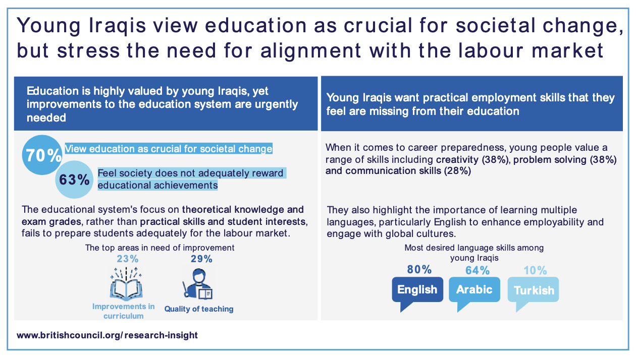 Education as key to societal change: Iraq’s education sector has also been severely impacted by conflict, displacement, and the Covid-19 pandemic, resulting in damaged infrastructure, low teacher training investment, and disrupted learning processes. The educational system’s focus on theoretical knowledge and exam grades, rather than practical skills and student interests, inadequately prepares students for the labor market. Improvements in the curriculum (23%) and the quality of teaching (29%) are seen as key by young people. Addressing these issues requires systemic reforms to enhance the quality and relevance of education to better align with market demands.