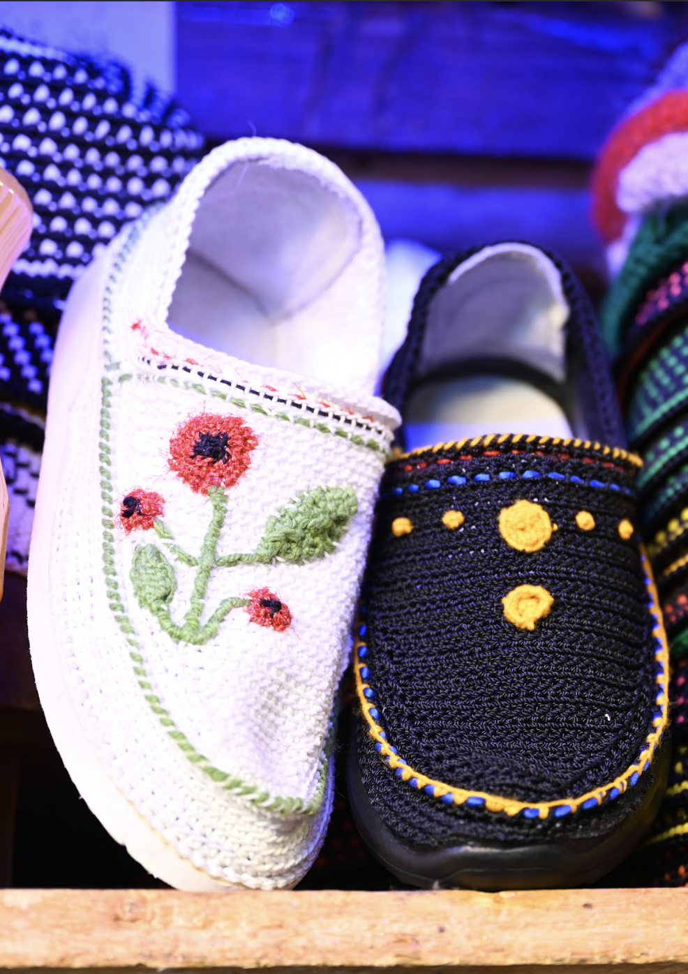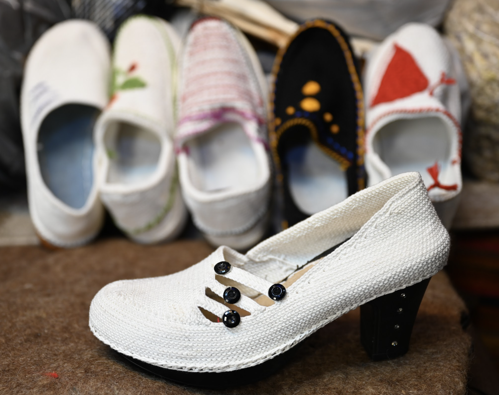 The material preparation first consists of dying and preparing the wool and cotton for weaving, which requires precision as well as attention to detail to make sure the colors match. The upper part of the shoe is woven by hand using a traditional loom, which involves creating unique shapes and designs. The shoe’s sole, on the other hand, is made from layers of compressed wool or leather, which are stitched together to create a durable base. The finishing touches – decorative needlework and stitching – are then added to the upper part to the sole.