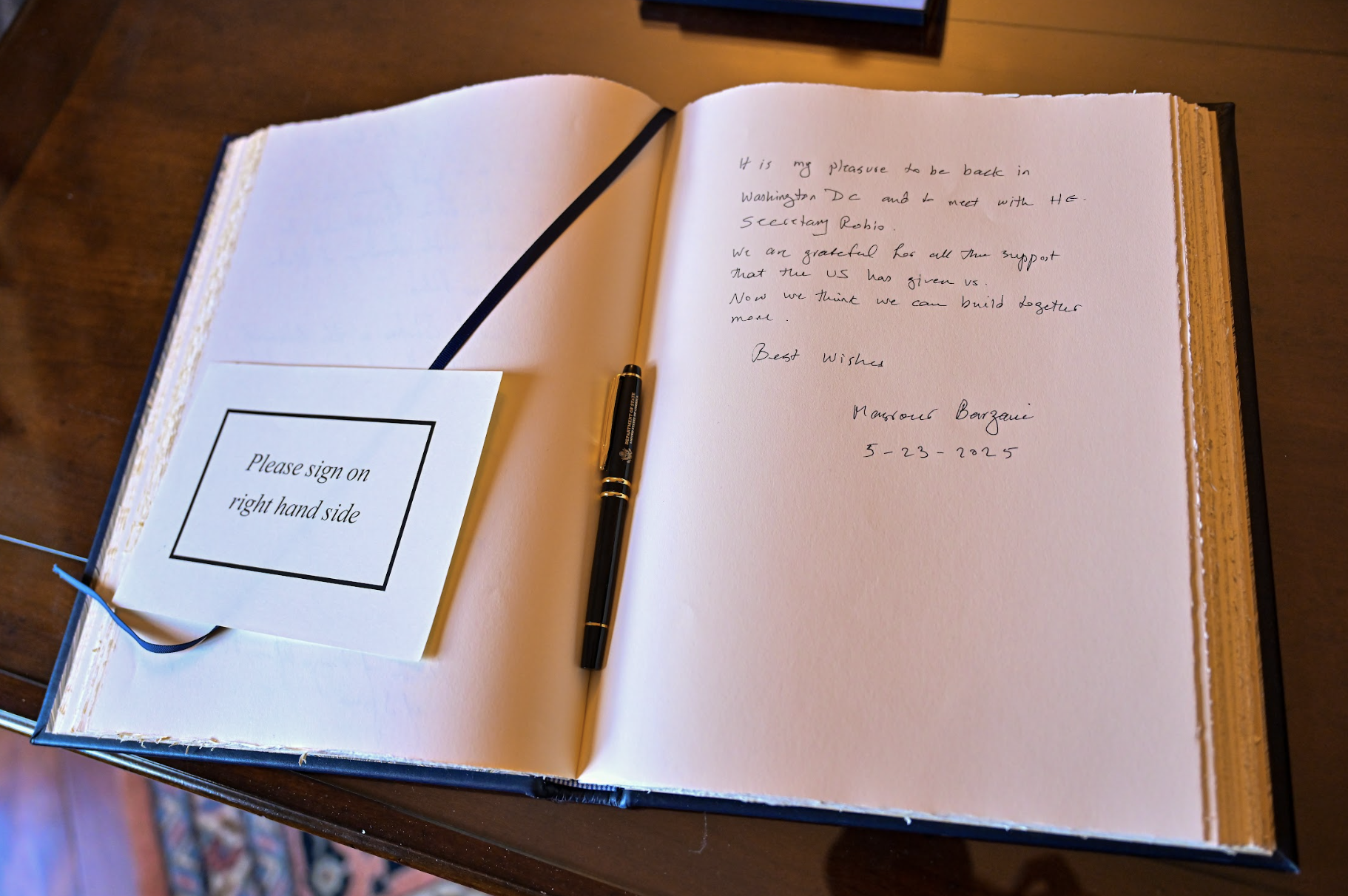 As part of diplomatic tradition, Prime Minister Barzani signed the U.S. Department of State’s distinguished visitors’ book. He wrote, “It is my pleasure to be back in Washington and to meet with His Excellency, Secretary Rubio. We are grateful for all the support that the United States has given us. Now, we believe we can build together.”