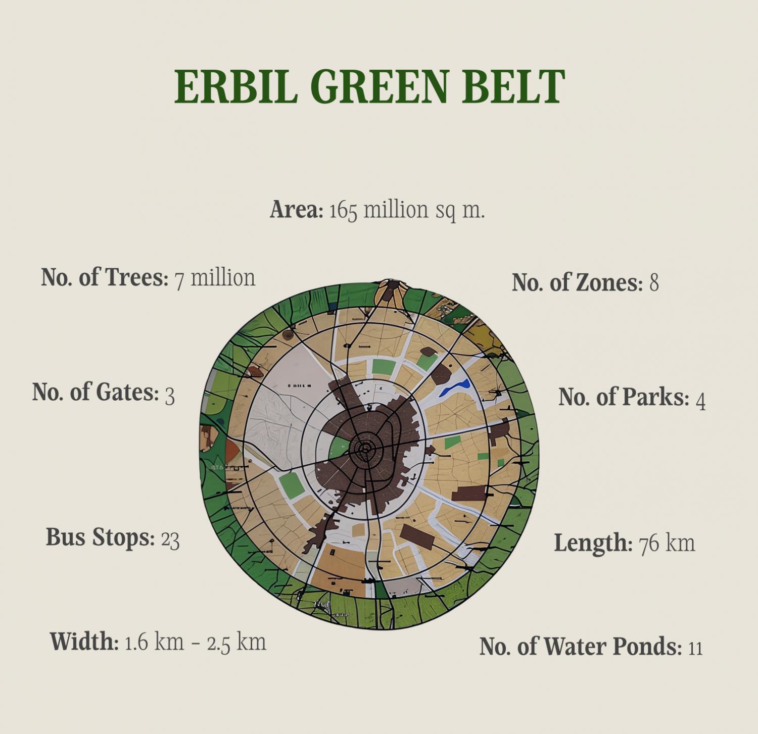 The Green Belt is a 75-kilometer-long green space that follows the urban design of Erbil to form a circle around the city. Varying in width from 1.6 to 2.5 kilometers, it covers a total area of 165 million square meters.
