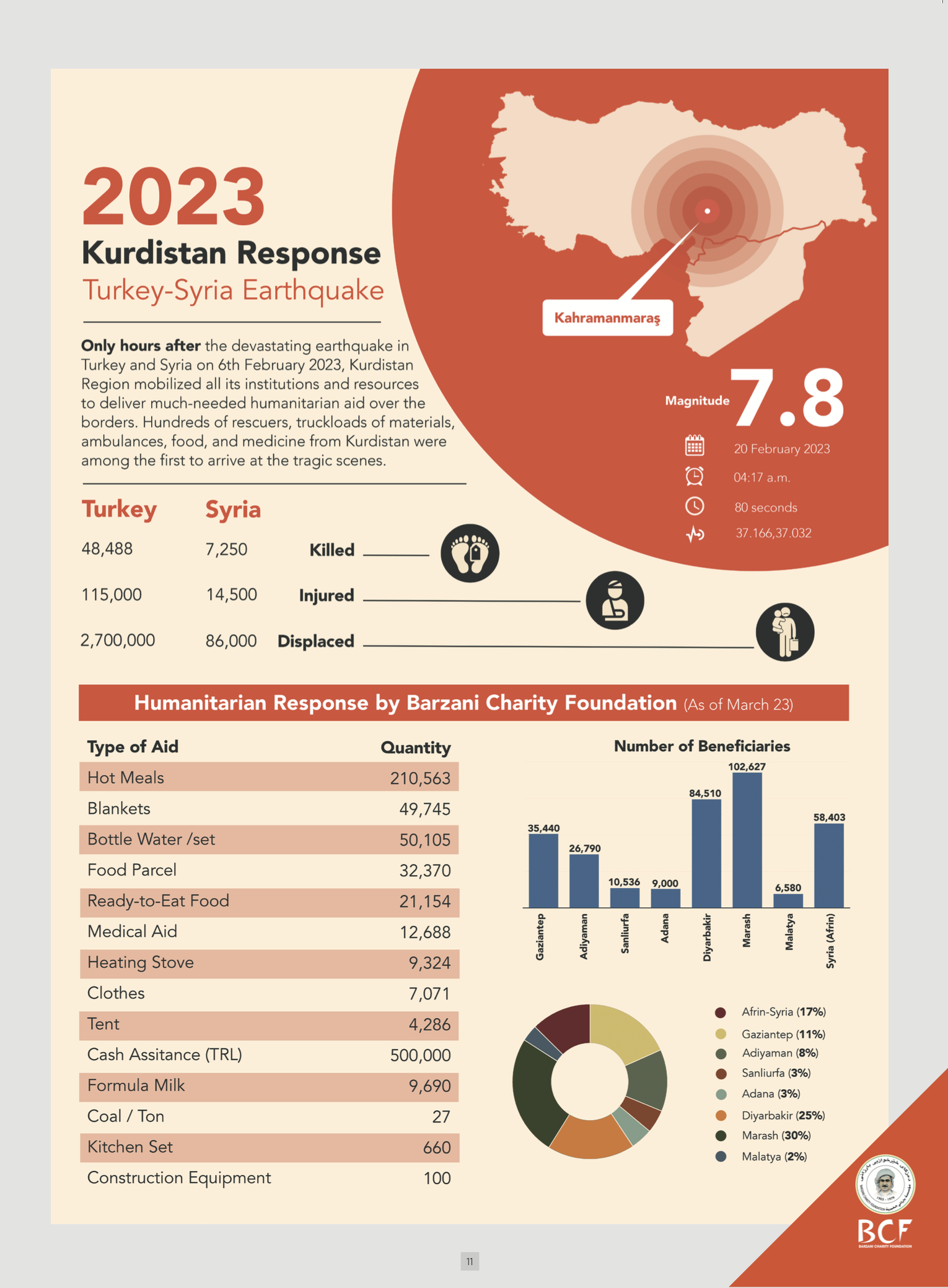 On 6th February 2023, a massive earthquake hit south of Turkey and northwest of Syria, leaving over 55,000 people killed, more than 135,000 injured, and many more homeless and desperate for help. As the world watched in shock, one organization quickly sprang into action to provide aid and support to the affected people. The Barzani Charity Foundation (BCF), a non-profit humanitarian organization based in the Kurdistan Region, immediately mobilized its resources to respond to the disaster and help its neighbors.