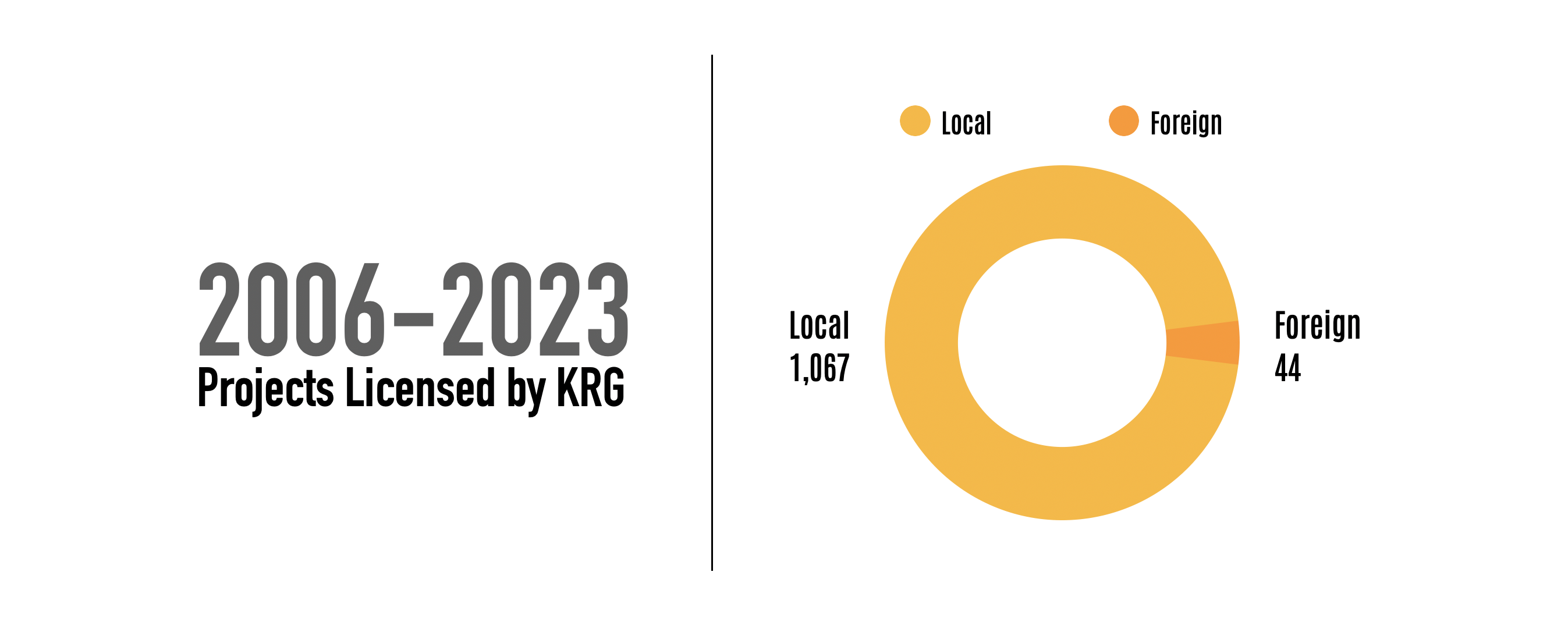 In 2022, the KRG's Board of Investment licensed a total of 93 projects, and it is actively working to increase this number. Since 2006, the KRG has licensed a total of 1,111 projects with a total capital of $66.5 billion, out of which 44 were foreign investments. Additionally, many foreign businesses have partnered with local investors to form joint venture projects in the Kurdistan Region.