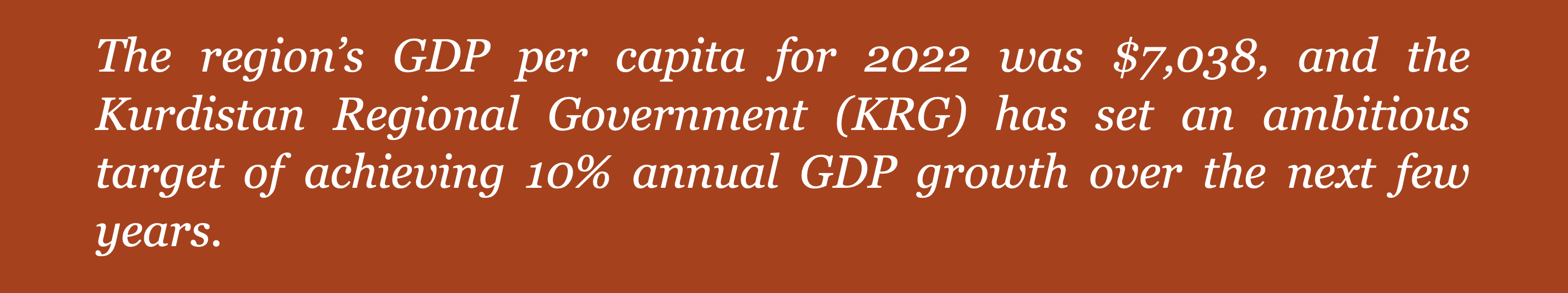 According to the Kurdistan Board of Investment, the region has licensed a total of 45 foreign projects with a total capital of $10.58 billion and 29 joint venture projects with $1.68 billion, and the trend is only growing. The region's GDP per capita for 2022 was $7,038, and the Kurdistan Regional Government (KRG) has set an ambitious target of achieving 10% annual GDP growth over the next few years.
