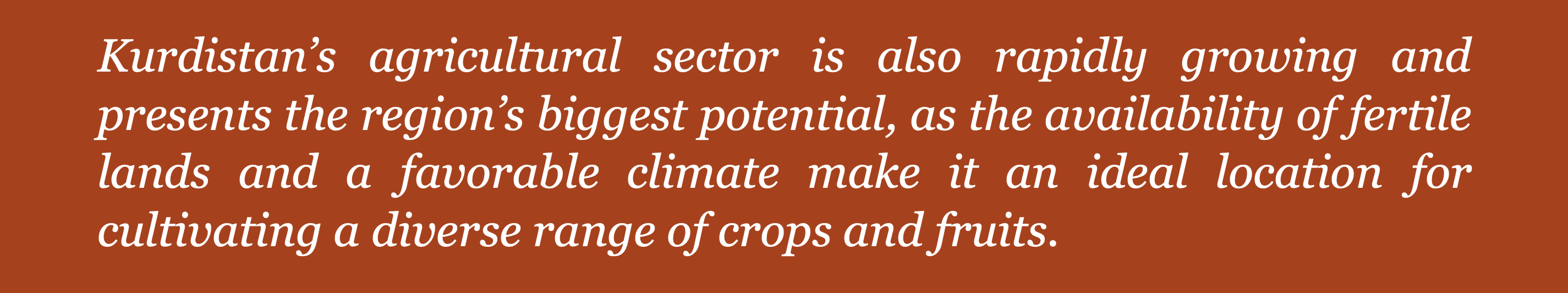 Kurdistan’s agricultural sector is also rapidly growing and presents the region’s biggest potential, as the availability of fertile lands and a favorable climate make it an ideal location for cultivating a diverse range of crops and fruits. According to the KRG, the sector has grown steadily in recent years and is projected to continue to expand, with the aim of transforming the region into a crucial food source for Iraq and neighboring countries.