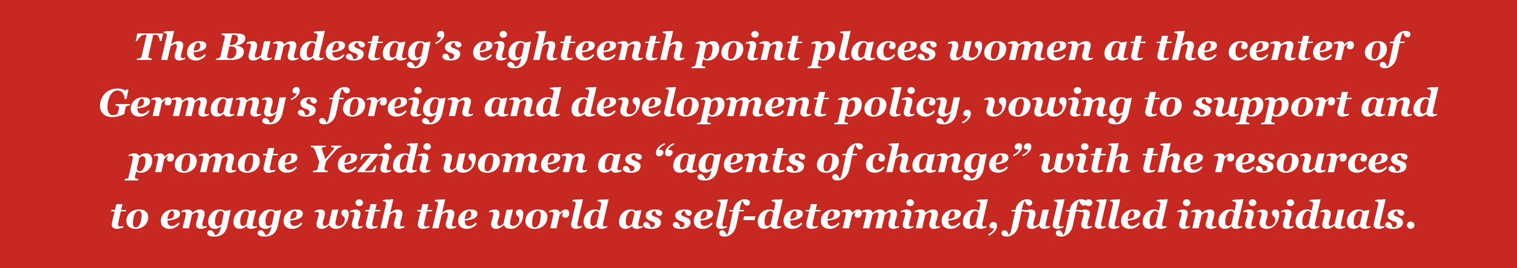 The resolution emphasizes multiple components of holistic wellness for the Yezidis at risk, such as stabilizing Sinjar, resolving community uncertainty concerning children conceived through rape, and addressing the vulnerable situation of impacted Yezidi women. The Bundestag's eighteenth point places women at the center of Germany's foreign and development policy, vowing to support and promote Yezidi women as "agents of change" with the resources to engage with the world as self-determined, fulfilled individuals.