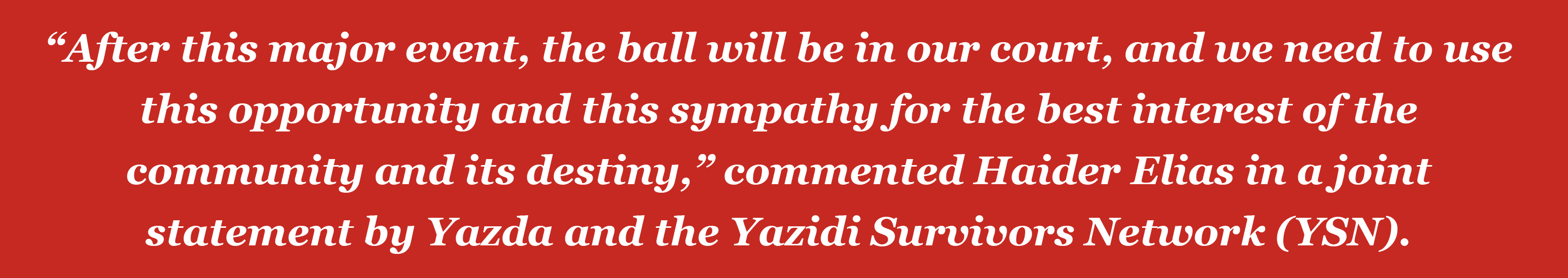 "After this major event, the ball will be in our court, and we need to use this opportunity and this sympathy for the best interest of the community and its destiny," commented Haider Elias in a joint statement by Yazda and the Yazidi Survivors Network (YSN).
