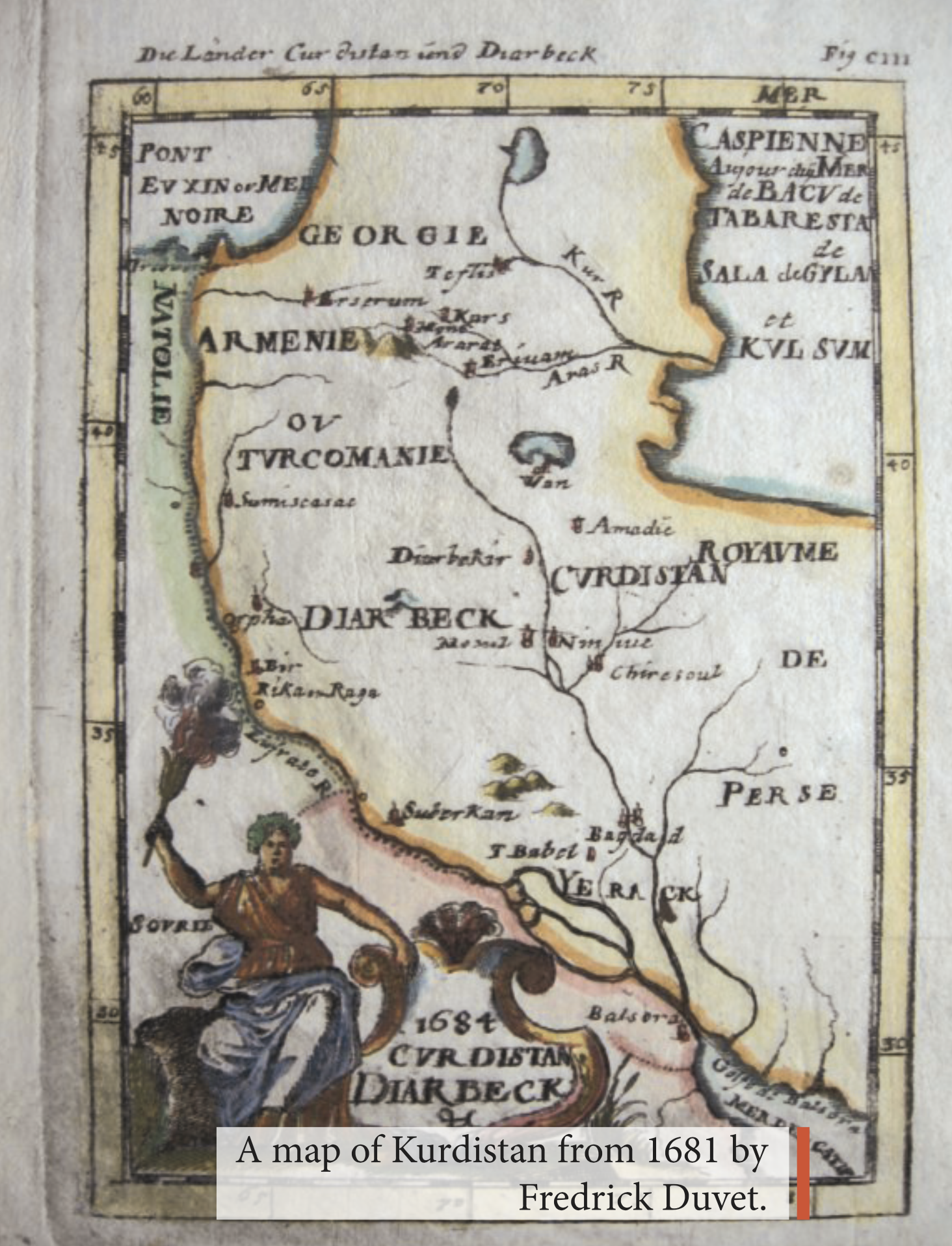 But the appearance of the name Kurdistan on maps as a Kurdish homeland or a region inhabited by Kurds dates to 1680 AD, meaning three hundred and thirty years ago, when the Dutch cartographer Frederick Duvet (1630-1706) published his map in which he drew the countries of the Ottomans, Iran, Armenia, Georgia, and other countries in the Middle East.