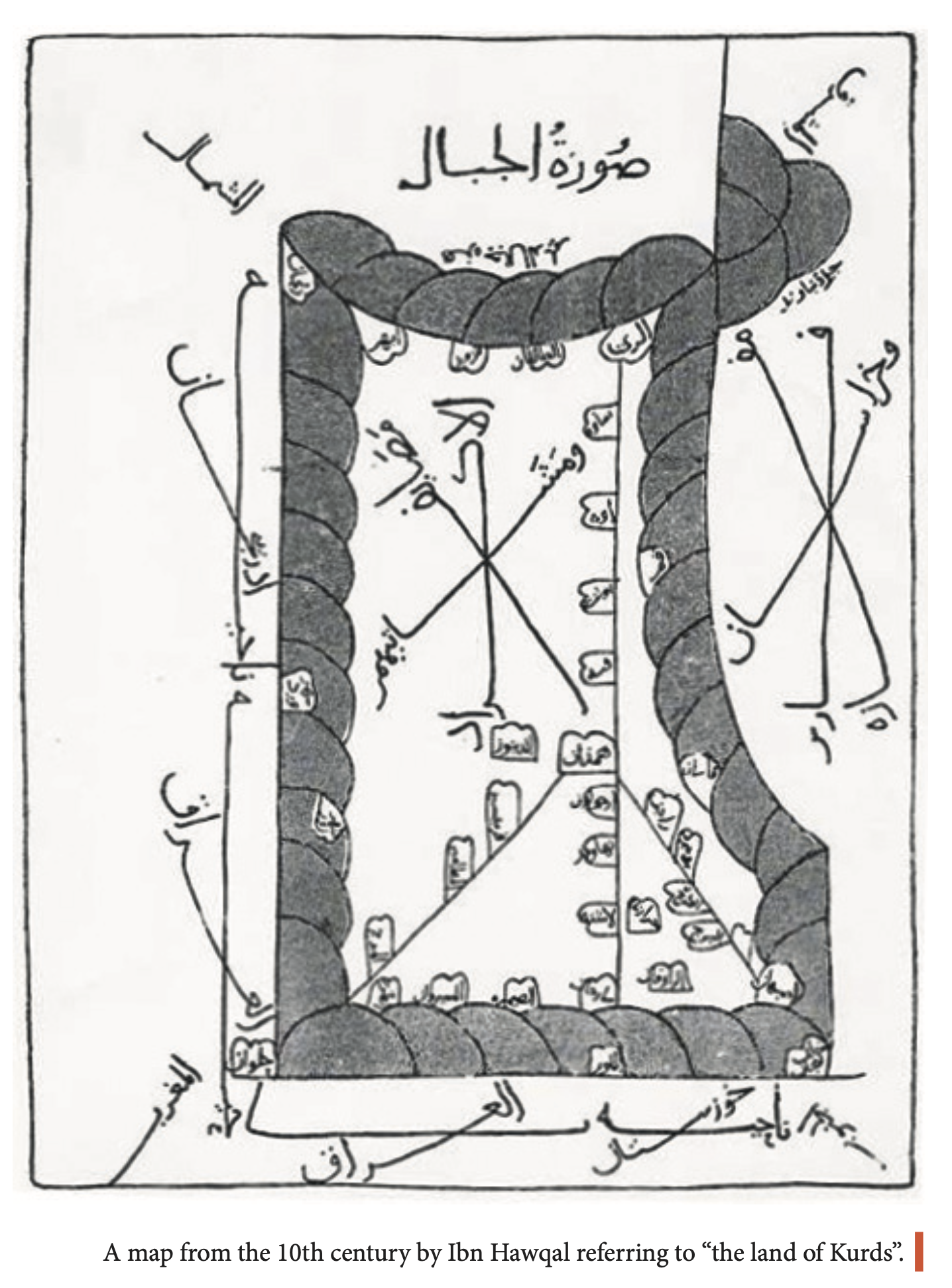 One ancient cartographer who referred to the land of Kurdistan was Ibn Hawqal (died 977 AD), author of the famous Sourat Al-Ardh (The Earth Image). In this valuable book, he published a set of maps that he had drawn himself of the known geographies of his time, wherein all of them refer to Kurdistan as the mountains. In one, he drew a special map of Kurdish areas calling them “Kurdish Resorts, Summer Cottages and Their Groves.”