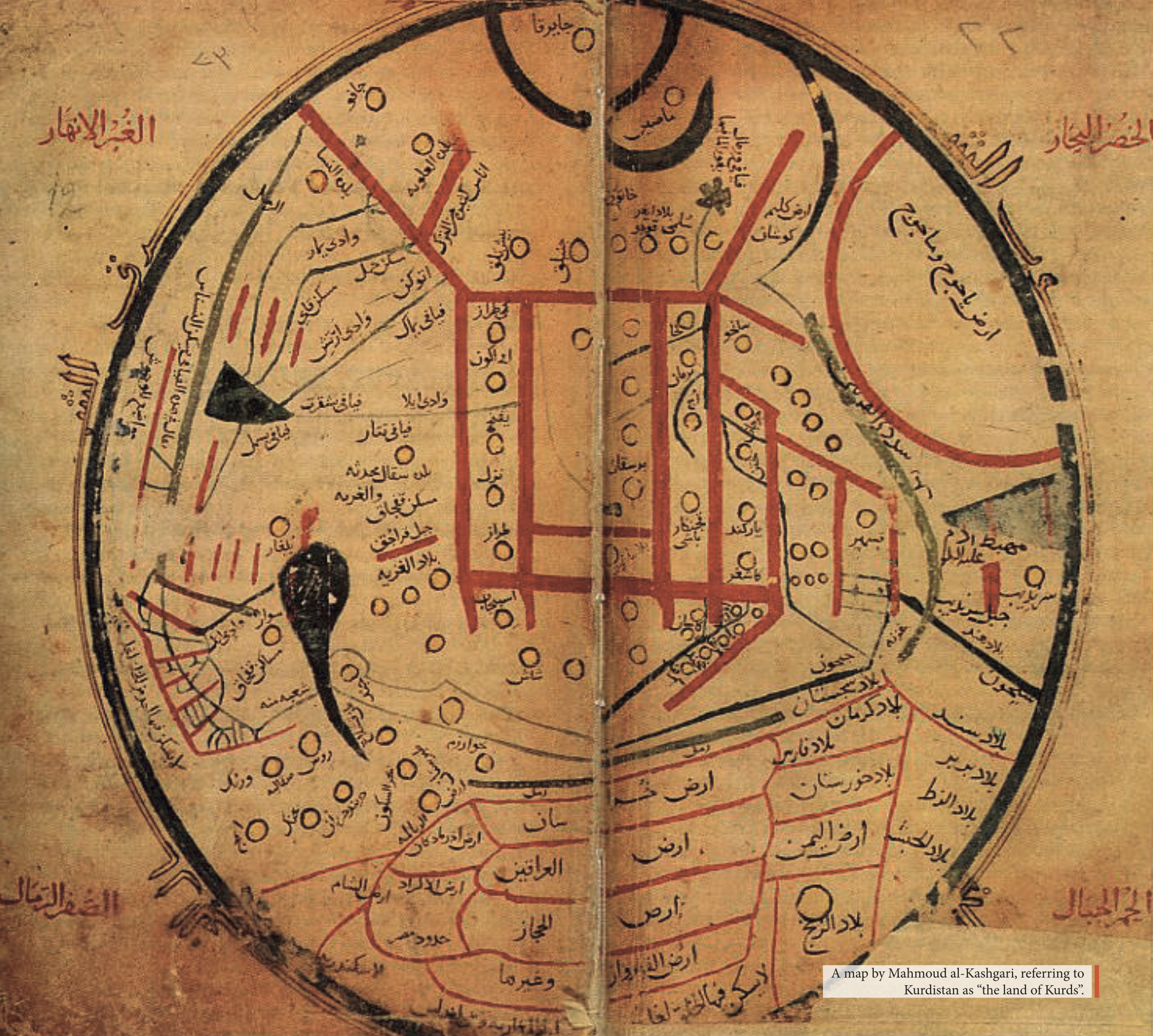 After this, the famous historian, geographer, and linguist Mahmud Al-Kashgari (1008-1102), who wrote the book Diwan of Turk Languages, published a map in which he referred to Kurdistan as the land of the Kurds and detailed that its borders met with Iraq, Khorasan, Azerbaijan, the Levant, and Egypt. Undoubtedly, the phrase “The Land of the Kurds” is a literal translation of the word Kurdistan, as the word ‘stan’ or ‘istan’ means a ‘country’ or ‘land’ in Persian.