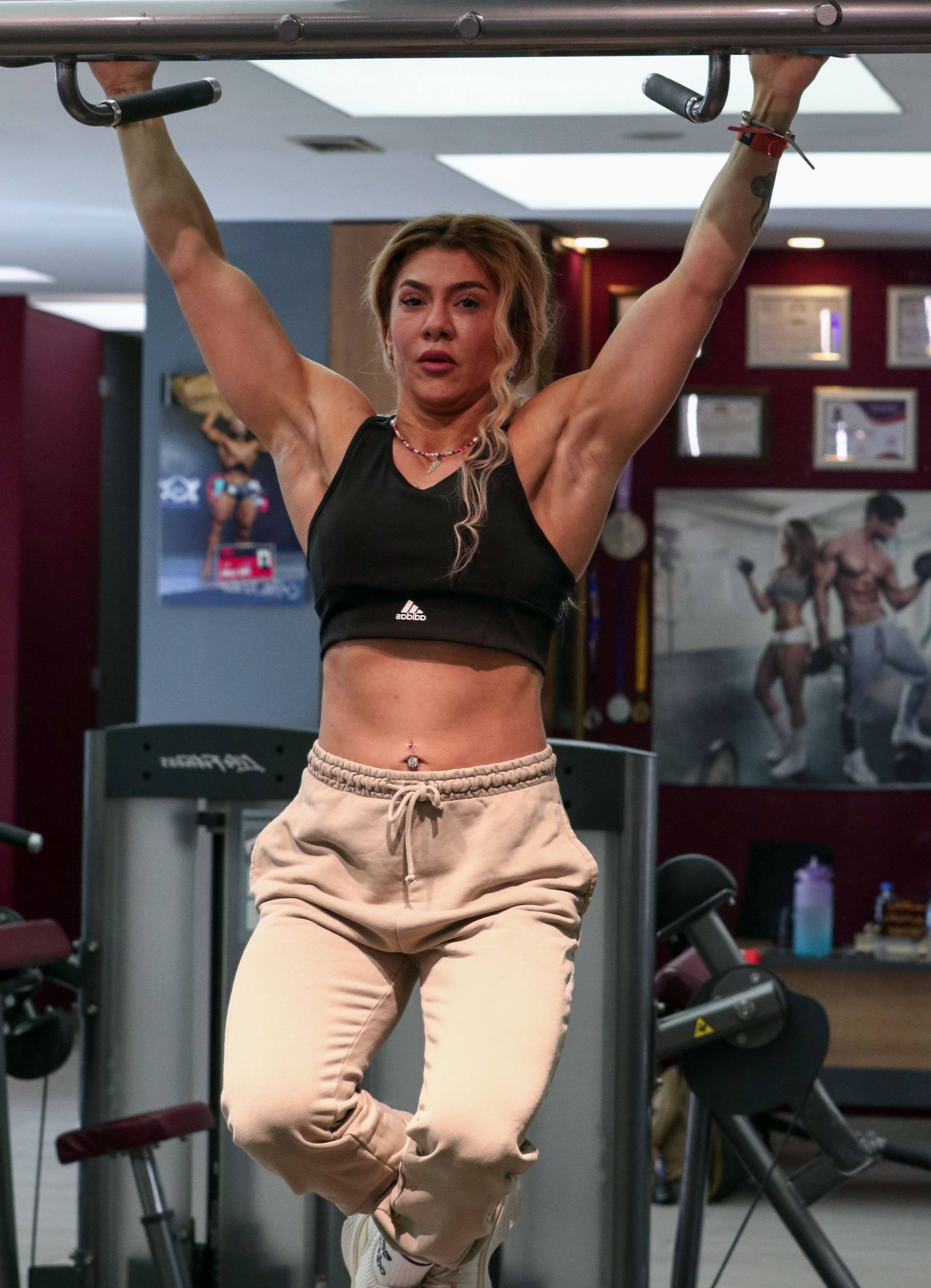 Her training routine includes a warm-up followed by a combination of weight machines, dumbbell exercises, and push-ups. With her powerful shoulders adorned by cascading hair, she exemplifies strength and determination.