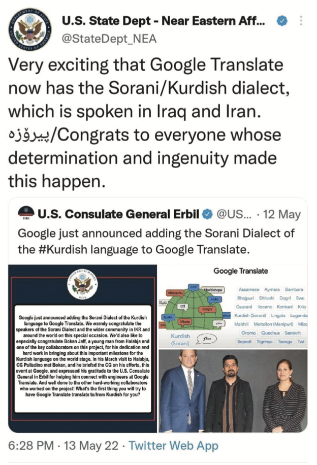 After working for over seven years and translating and validating over 1,300,000 pieces of data to add Sorani to Google Translate, the U.S. consulate asked me for a meeting on March 16, 2022, in Halabja. U.S. Consul Robert Paladino and Gina Cabrera visited Halabja to discuss the project, and they told me that Google had finally decided to add Kurdish Sorani as a tribute to the victims of the Halabja chemical attack, the Anfal campaign, and Kurdish victimization in general.