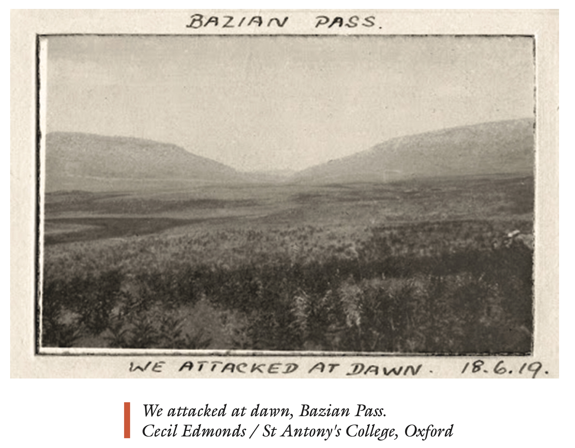 Cecil Edmonds was to accompany the expedition, which left Kirkuk for Chamchamal on June 15, 1919. The next morning, Edmonds was up at half-past three for a reconnaissance towards the Bazian Pass, which Shaikh Mahmoud was reported to be holding on both sides. Edmonds described the dramatic setting for the pending confrontation: