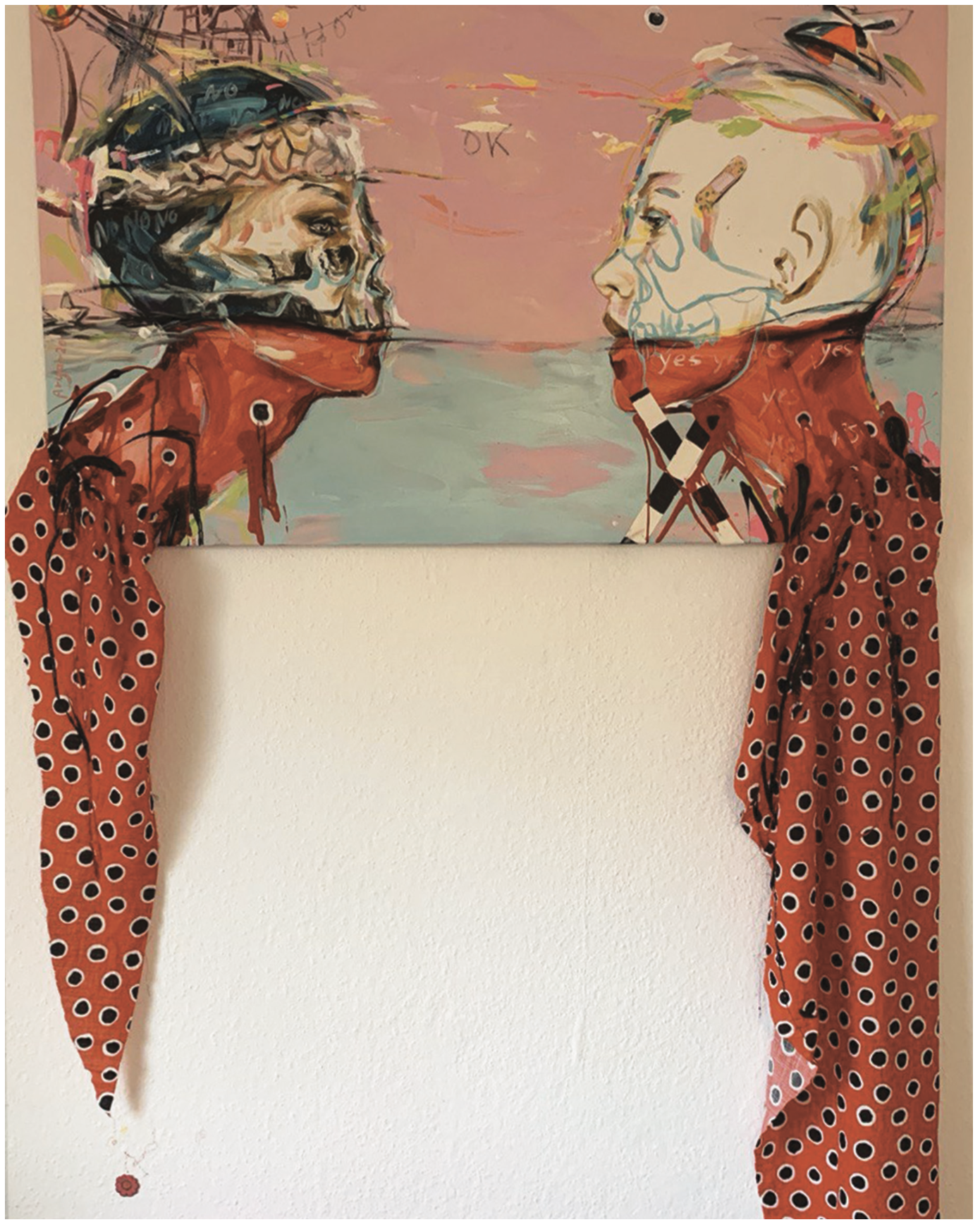 AA: I was in a refugee camp and didn't have enough tools and colors for painting, so I used bed sheets, curtains, and all available fabrics to paint on and use them as collages to provide color. Kurdish patterned fabrics have always fascinated me, so I decided to incorporate them into my paintings and develop this technique with a contemporary artistic style that approaches pop art and abstraction. We Kurds have a colorful and rich identity, which enriches my experience and gives it a unique identity. The war has separated us from our country and from each other, but our culture, music, food, and stories bring us together once again. We want to positively share this diversity with other cultures. Differences can be positive, and we can utilize them to build bridges and exchange ideas, rather than for making war and bloodshed. Culture and art are our tools against war.