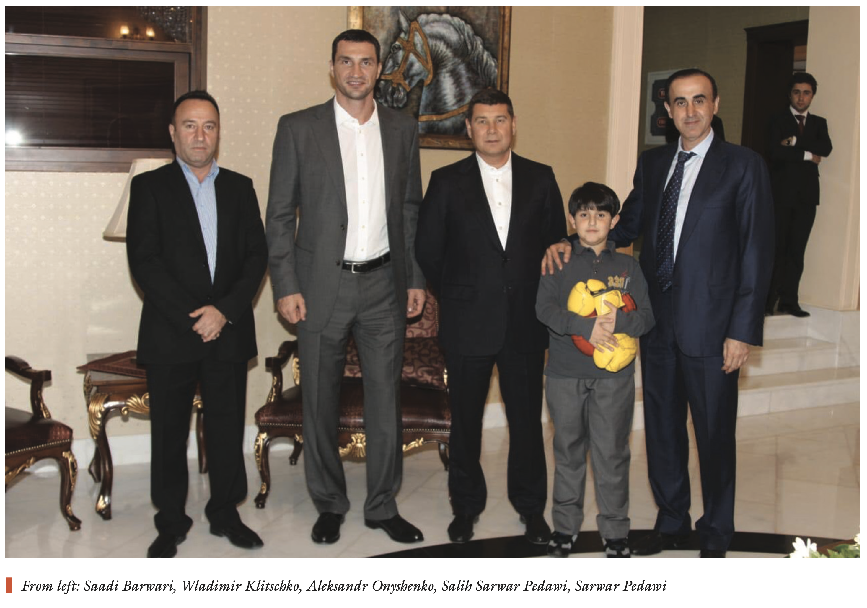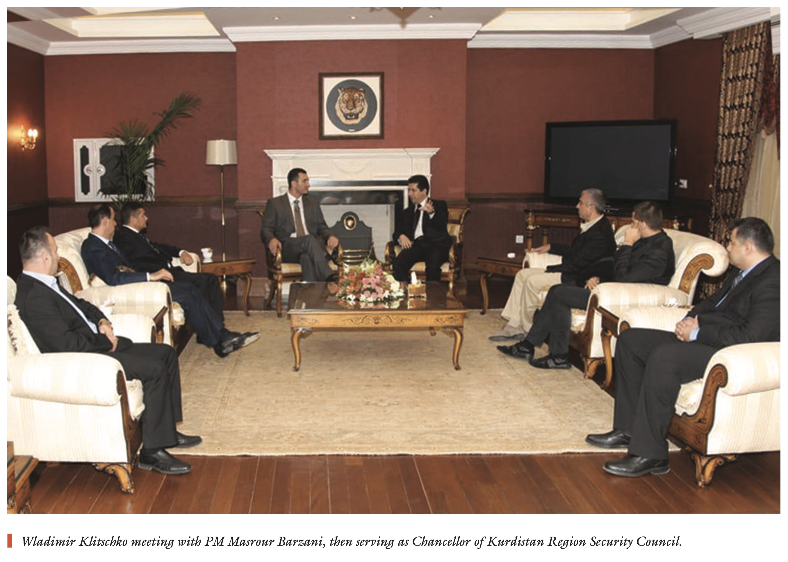 On October 20, 2011, Wladimir Klitschko arrived in Erbil on a private jet. His visit was organized by prominent Kurdish figure Sarwar Pedawi. During the visit, Klitschko met with President Masoud Barzani and Masrour Barzani, the incumbent prime minister of the KRI who then served as the chancellor of the Kurdistan Region Security Council.