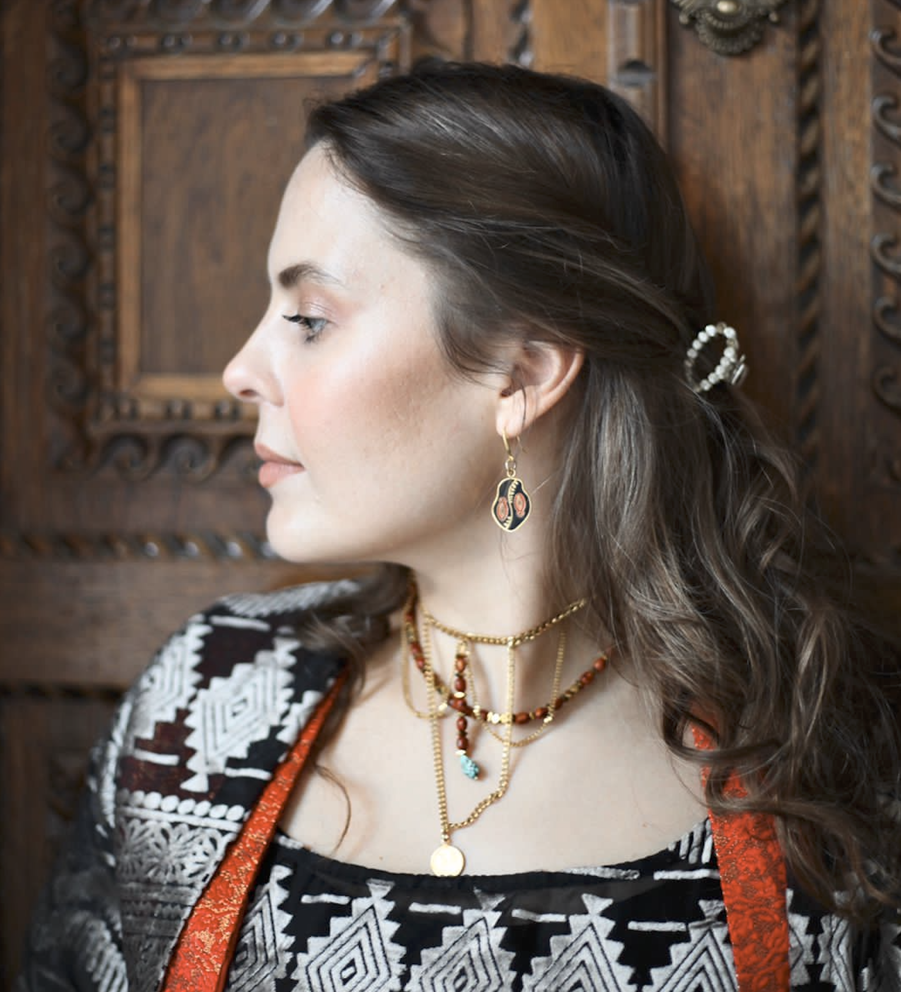 Naskeh started her artistic career by engraving and drawing on stones. She showed me a beautiful collection of them that had matching colors, which she had collected in a basket. “At twenty, I had my first art show on International Women's Day, in cooperation with the French Consulate in Erbil. That was 2017. I started working on accessories and engraving them with enamel two years later when I was twenty-two years old.”
