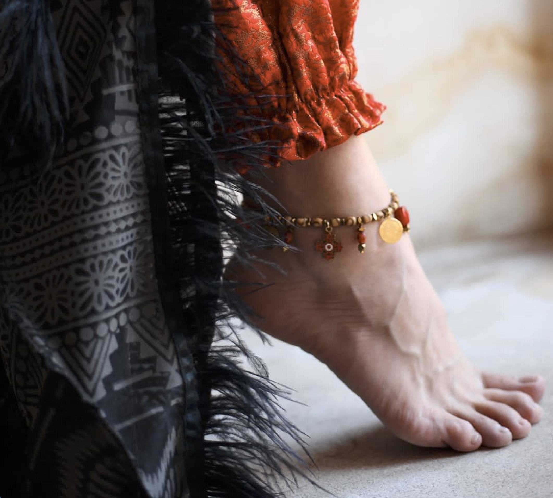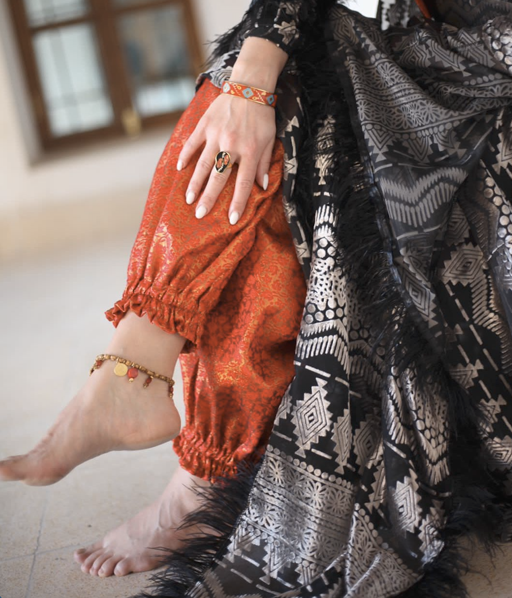 "People think this inscription is simply a cross, but it is actually of a traditional inscription that adorns the Kurdish scarf, which is known as hibri-hawri. I like to create a mix between Kurdish art and Red Sea coral," she says, as she juxtaposes the necklace stone with the beautiful red inscription on the edge of the scarf, which is called a Mosul scarf by some. Indeed, they are identical. How beautiful!