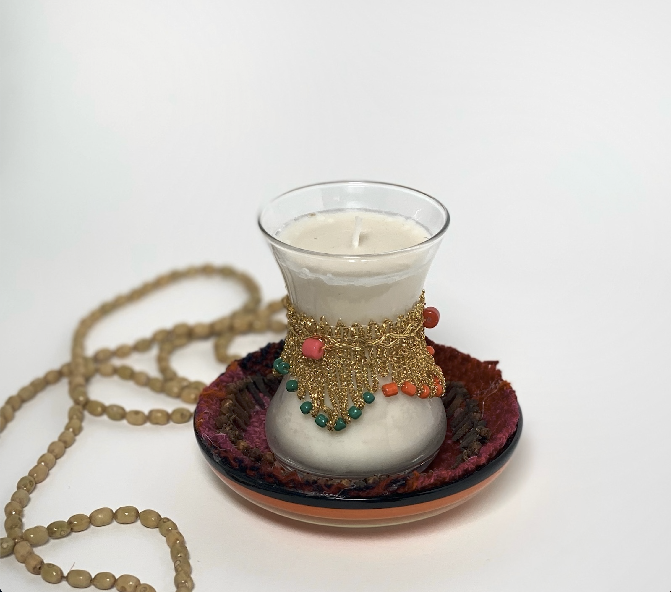 In 2017, while I was working on the final draft of my MA thesis on the para-diplomacy of the KRG, I focused on the importance of culture and was inspired to launch something along these lines. As a lover of candles, I wanted to mix culture and nature. One day by chance while I was sitting with my husband in the Machko tea shop located under the citadel in Erbil having a tea and was inspired to make candles inside the tea glass with little cultural elements of Kurdistan. I named it the Machko candle.