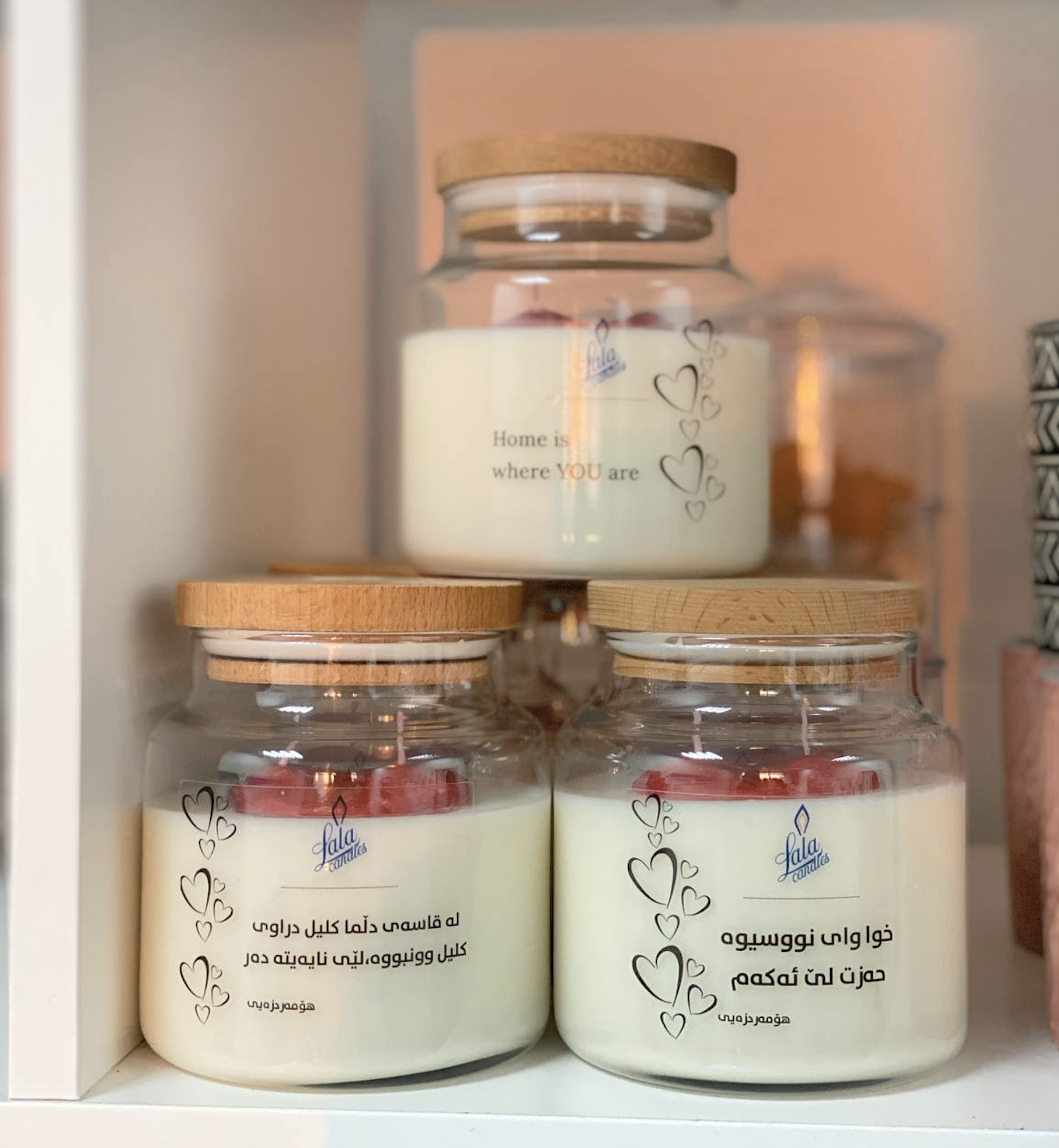 Today Lala Candles is an officially registered brand in the Ministry of Trade and Industry. Operating from a little warm studio in Erbil, we offer candles inspired by culture and nature to promote Kurdistan and proudly produce ideas that are worth seeing inside the citadel. Through our official website, customers can directly reach us and place their orders. We also offer two amazing services of white labeling candles for companies and big institutions, as well as a unique experience of candle-making workshops for groups in our studio in Erbil. With a strong team of three, we achieved this success slowly over five years.