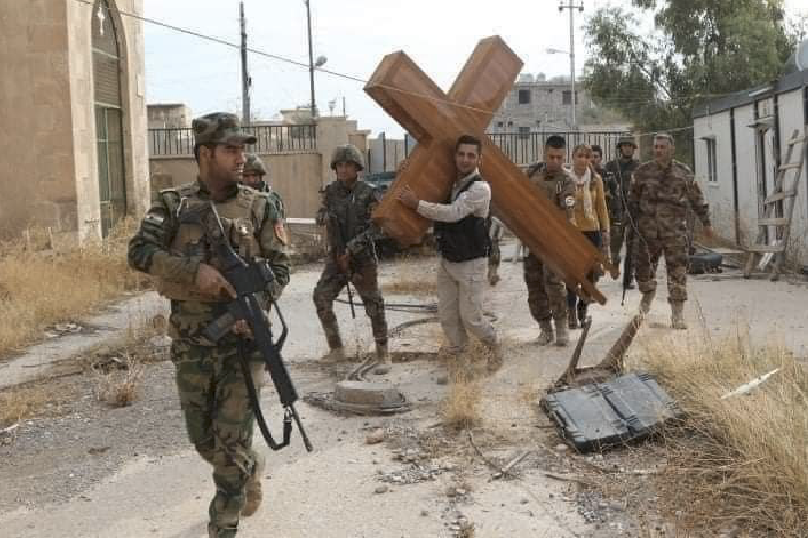 A group of Peshmerga fighters carrying a Cross to reinstall it on a church in Bashiqa after liberating the town from the ISIS (Nov. 2016).