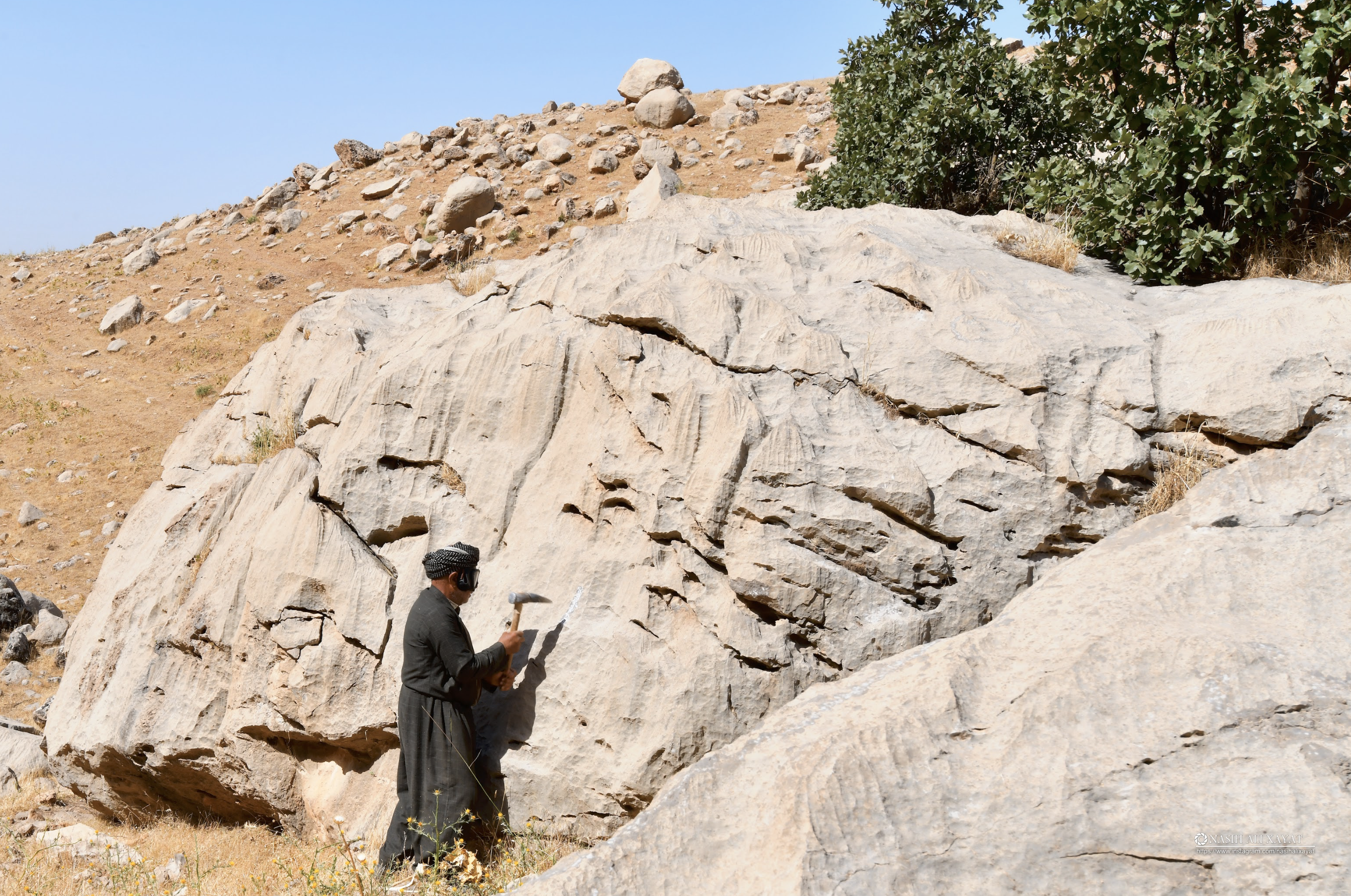 In addition, he never abandoned his artistic endeavors, continuing to pursue his childhood passion for art. This had started when Mullah Qaraman fell in love with art as a child. In the 1970s, he began sculpting, inscribing verses from the Quran and poems of prominent Kurdish poets on the stones of Mount Piramagrun. In 1976, he carved the English alphabet on a stone slab on the same mountain. After returning to Biran after Anfal, he did not consider his wife’s illness as an obstacle to his art. Every day, when he took the sheep and cattle to Mount Piramagrun, he carved some artistic works on the stone slabs. To date, he has sculpted more than 30 artistic works. Moreover, he used his tired hands to remove soil and rocks from Mount Piramagrun to build a road for people and cars. Despite all the difficulties, Mullah Qaraman played a significant role in serving the village of Biran.