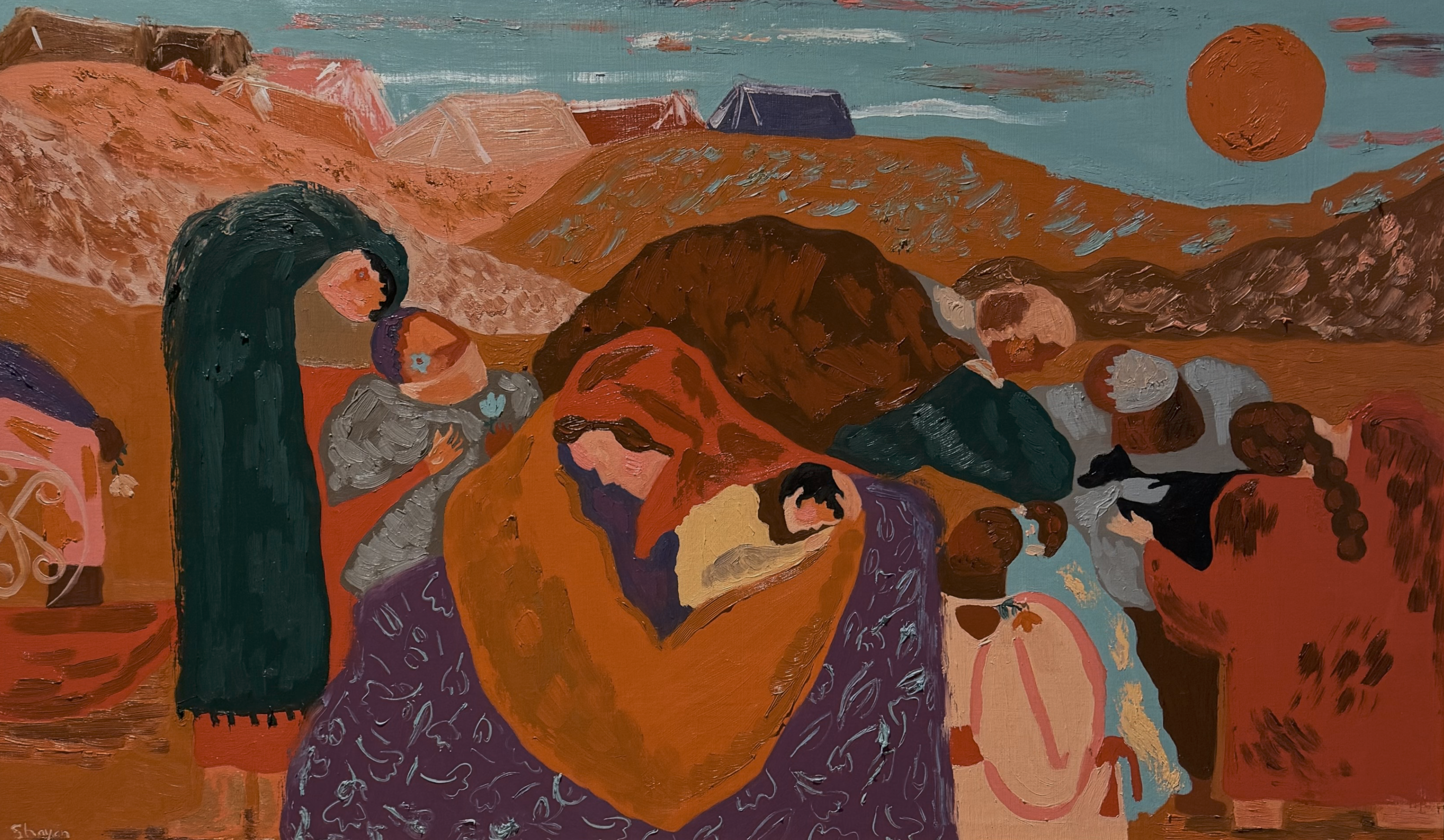 Nuradeen displayed nine paintings that shed light on various hardships faced by Iraqi children. These paintings, all based on firsthand encounters the artist had in the governorates of Nineveh and Kirkuk, address issues such as child labor, early marriage, displacement due to climate change, and disability caused by conflict.
