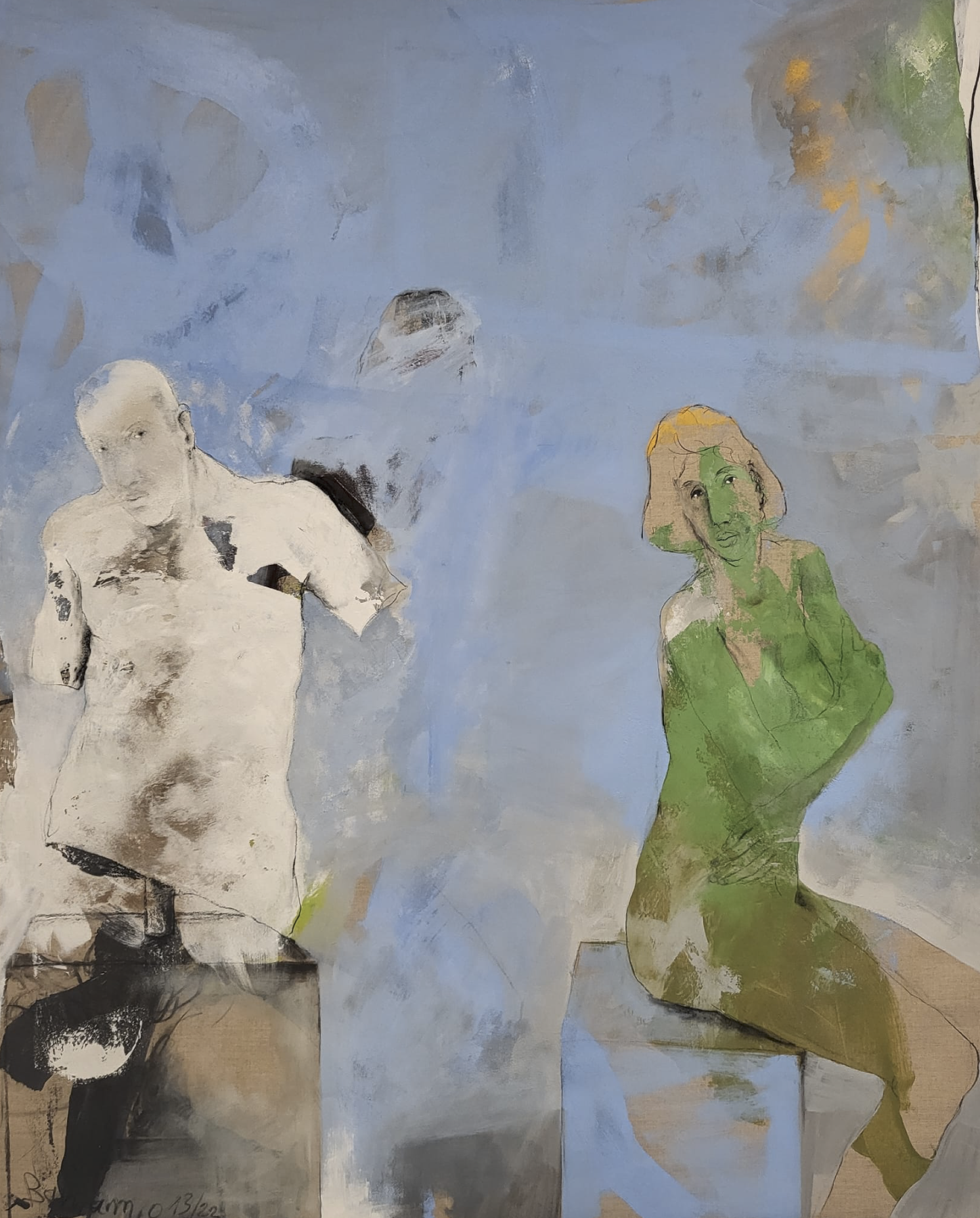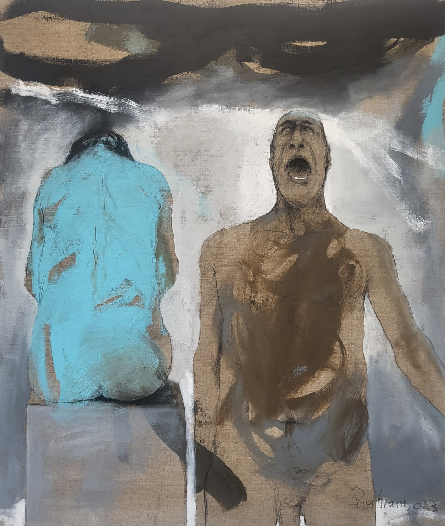 KC: Yes. You leave a large area in your paintings with no color at all. And you give women a distinct presence in your paintings! We see this duality of man and woman in almost every painting of yours. According to my understanding, some of your paintings portray hallucinations and nightmares. We see faces bearing the hardships of life. There is also pain in your paintings, as well as mystery.