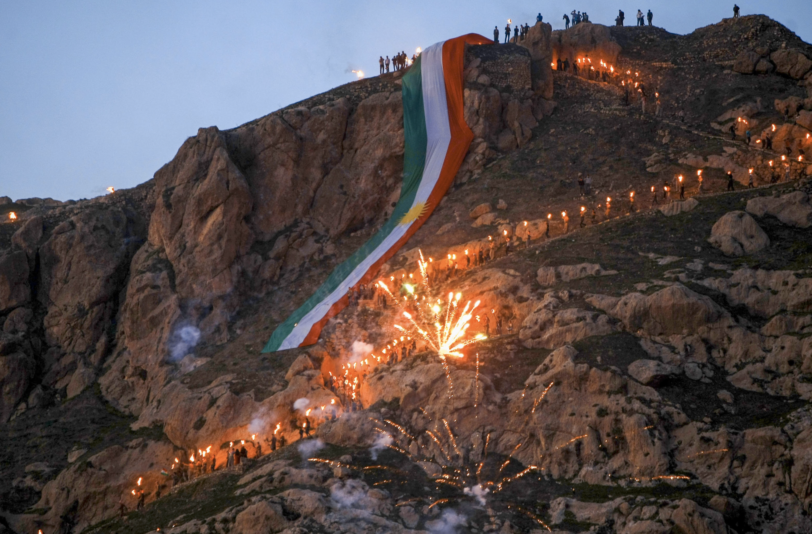 Amidst the pyrotechnic displays, a colossal Kurdistan flag unfurled atop Akre’s peaks, symbolizing unity and pride.