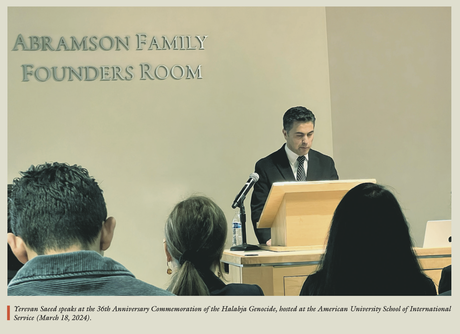 As the director of the Global Kurdish Initiative for Peace, Saeed hosted an event at the SIS on March 18, 2024, to commemorate the 36th anniversary of the 1988 Halabja chemical attack. The event saw the participation of notable speakers, including U.S. Senator Chris Van Hollen, who sent a video message expressing his solidarity with the victims of the attack.