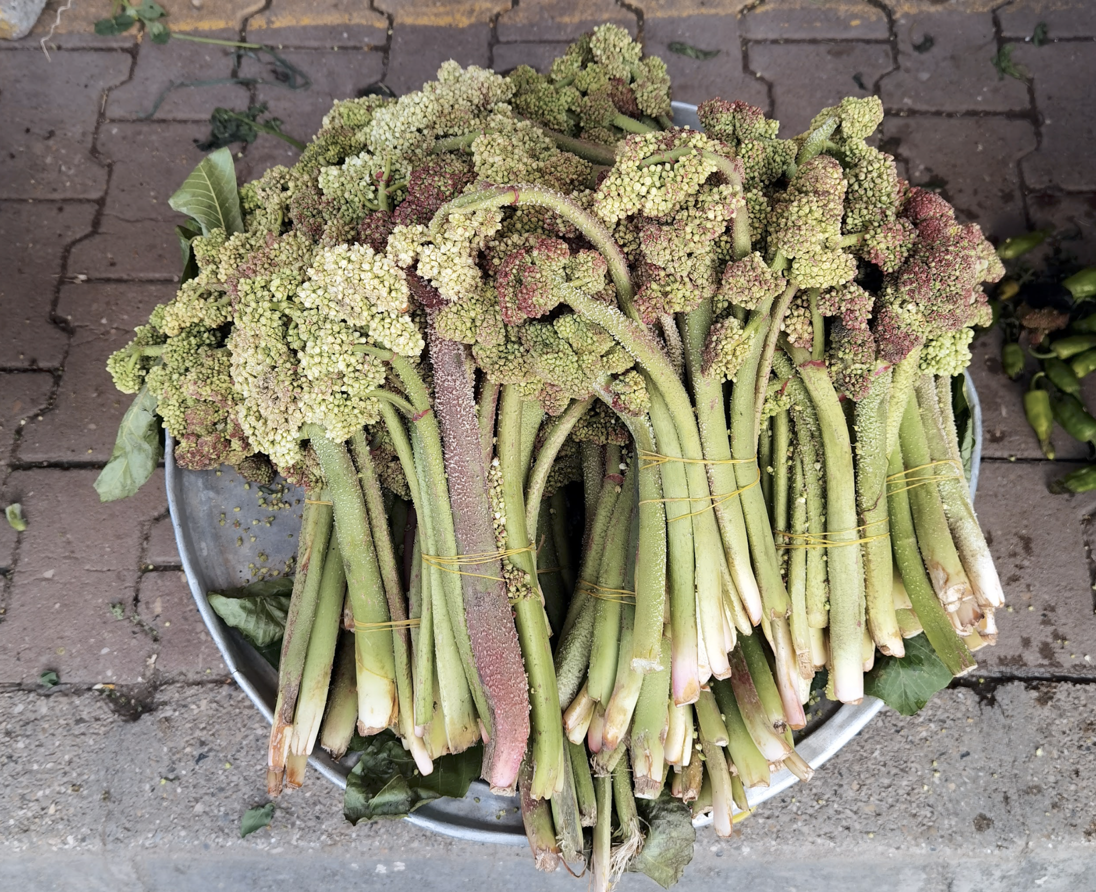 The flower-bearing stalks are the edible parts of the plant. The stalks are sliced and cooked with eggs in Turkey to make a dish known as iskinli yumurta, whereas in Iran its enjoyed as khoresh rivas, or rhubarb stew. In Turkey, Syria, the Kurdistan Region, Iran, Afghanistan, and Pakistan, locals also often consume the stalks raw in salads or sell them in local markets.