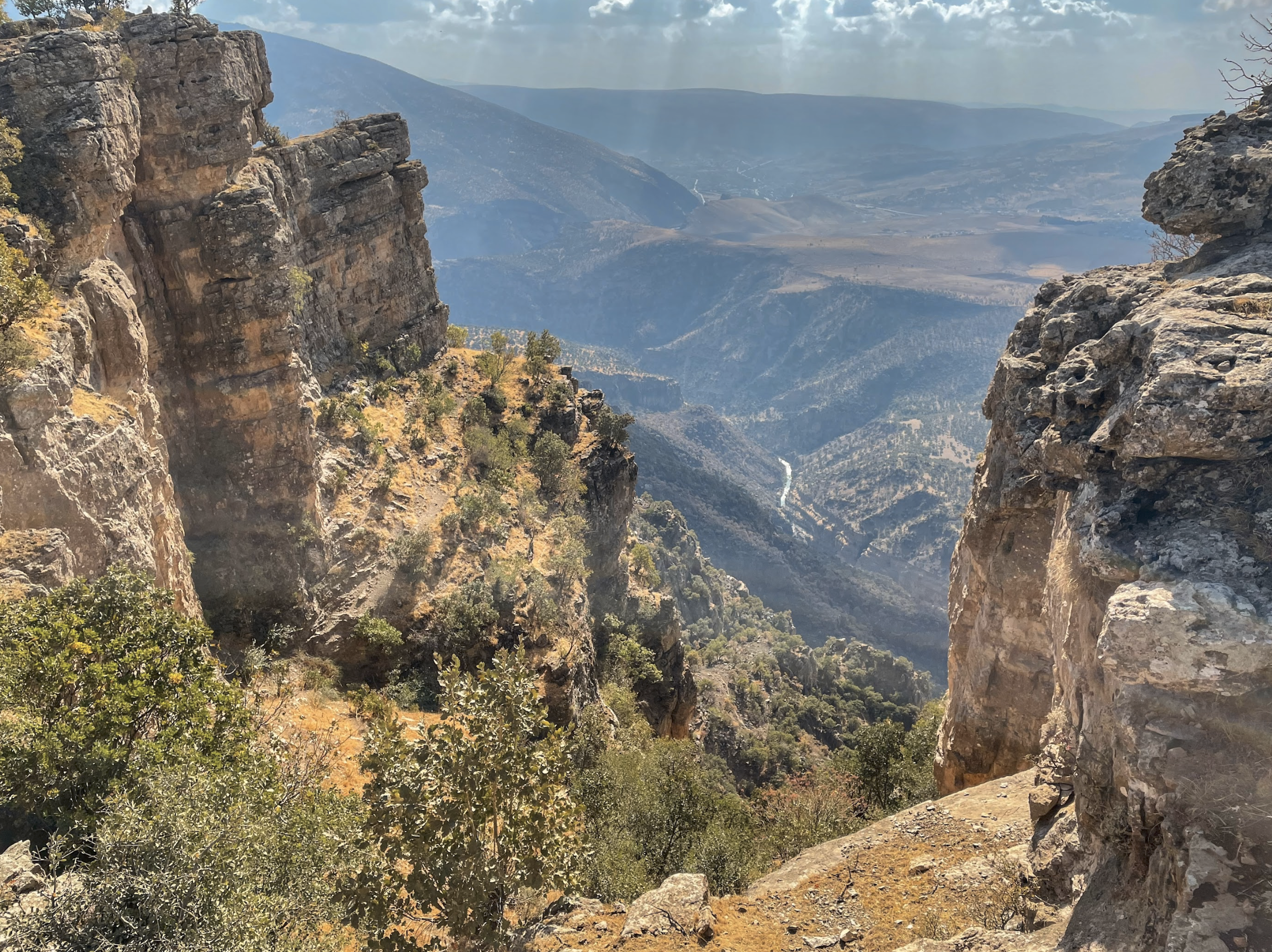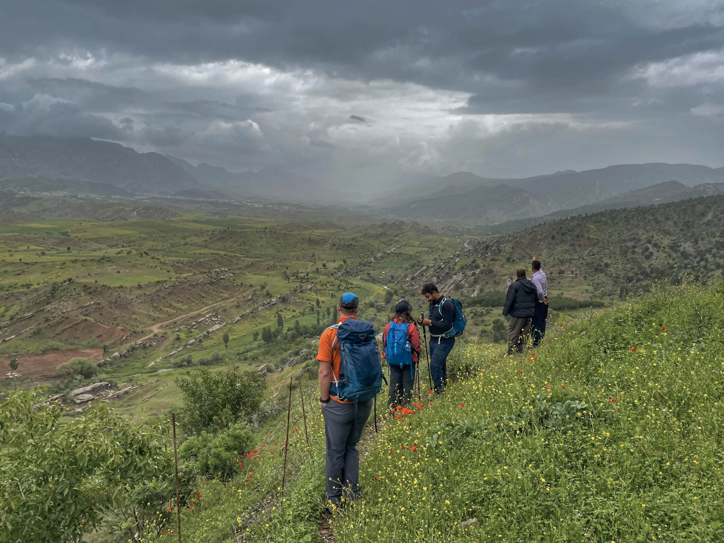 The group walked for a few hours along the shepherds’ tracks that wind out of Shush and along a small valley bounded on one side by high, craggy limestone and on the other by a lower, sharper ridge, with seams of rust and golden soil shining through. These hills are the final barrier before the great plains begin beyond, stretching out toward Mosul and the south.