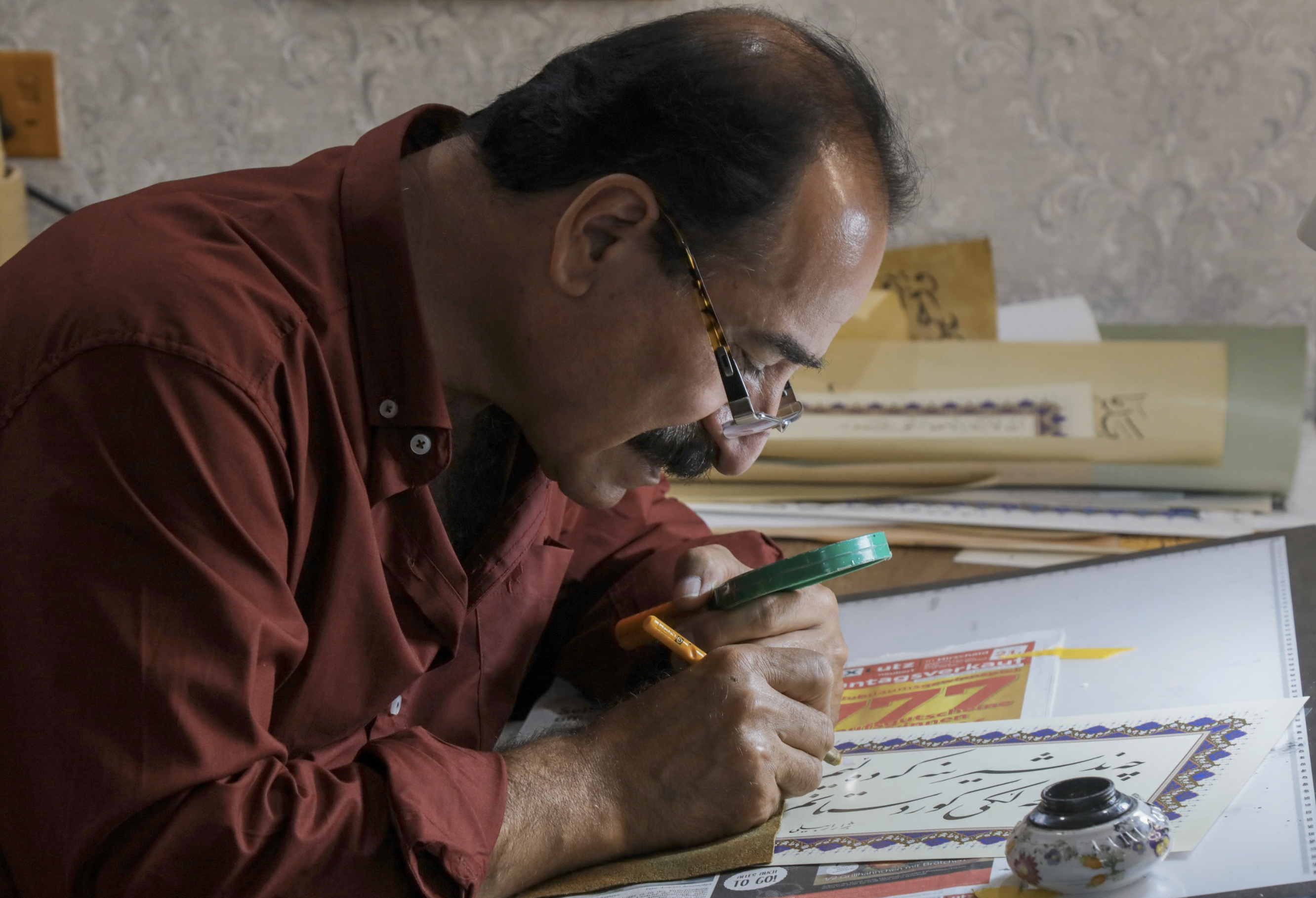 In his studio on the outskirts of Erbil, master calligrapher Bjar Erbili is surrounded by the warm glow of creativity. He dips his delicate broad-edged nib and brushes in ink, his movements filled with the quiet focus of a man possessed by his passion. The room is a witness to his talent, adorned with samples of his work, such as beautifully written gold-painted verses of the Quran and poems by notable Kurdish and Arab poets. A single copy of the Quran holds a special place in the center of the room, on a big table; it is a copy of the Quran that Bjar wrote for Sheikh Khalifa bin Zayed Al Nahyan, the former president of the UAE.
