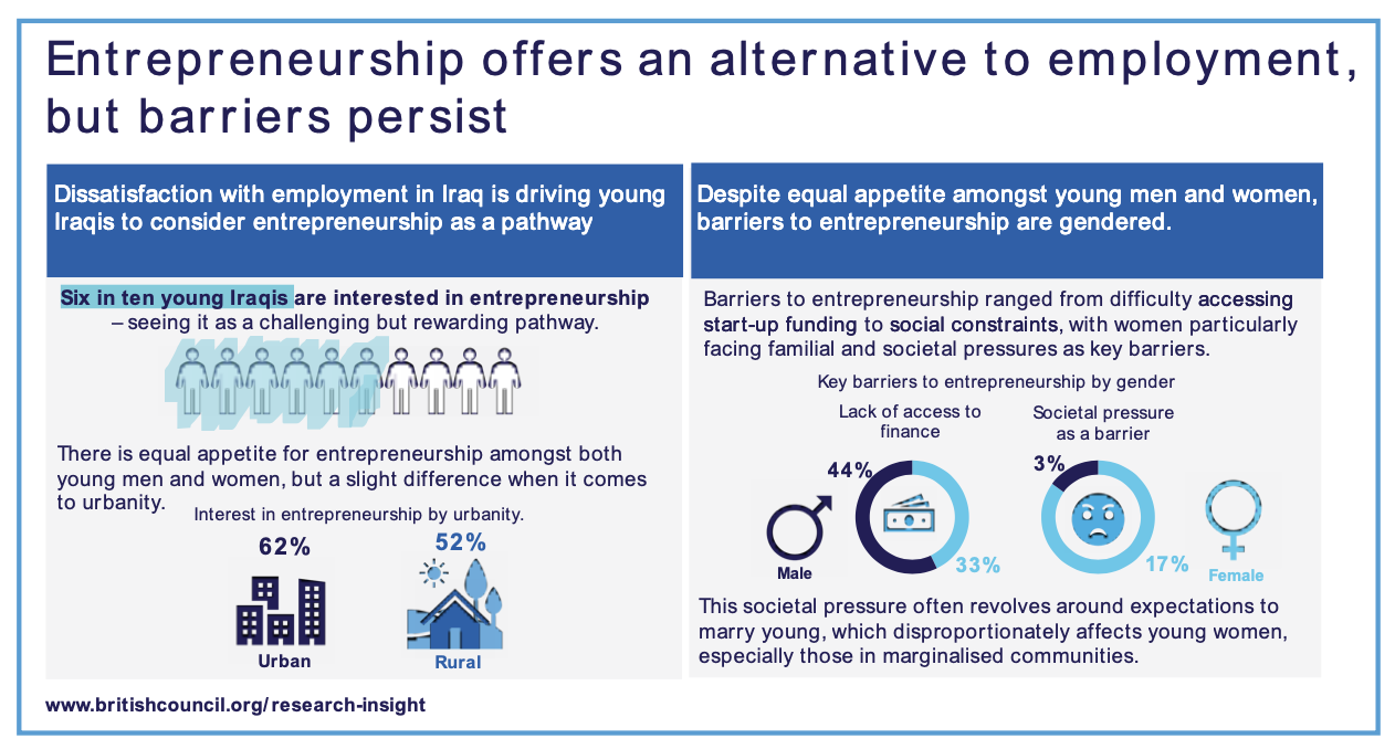 Urban residents (62%) show a higher interest in entrepreneurship compared to their rural counterparts (52%), with those in the Kurdistan Region (76%) being particularly keen on starting a business compared to those in north or western Iraq (46%).