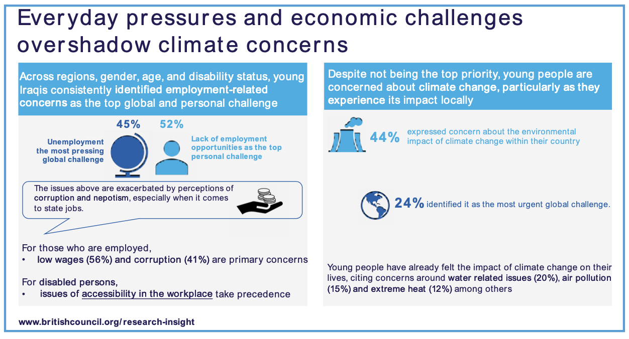 Climate concerns overshadowed by daily challenges: Unemployment (45%), poverty (48%), and extremism and violence (32%) remained significant global concerns among young Iraqis, stemming from reflections on security issues faced by previous generations in Iraq and discussions about their own futures. There is a clear urban and rural divide on perspectives on global challenges, with urban residents more likely to identify a broader range of global issues, including drug abuse and the drug trade, health crises and pandemics, and erosion of religious values, compared to their rural counterparts.