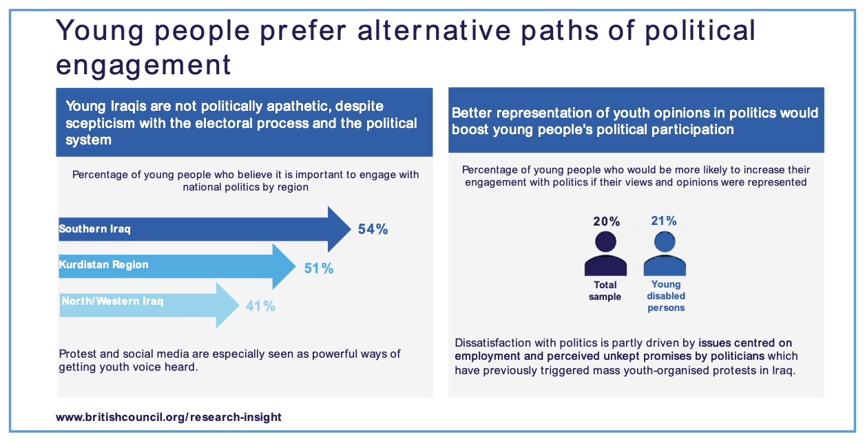 Young people recognize the importance of being politically engaged but are skeptical about the electoral process due to perceptions of unfulfilled promises and systemic issues. In response to this, protest and social media are seen as powerful ways for Iraqi youth to voice concerns and mobilize for change, but some young people hold reservations regarding their security and safety expressing their views online.