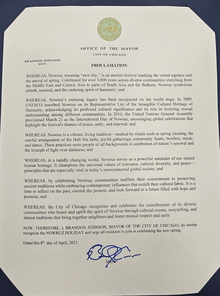 On April 8, 2025, in a momentous celebration of cultural heritage, Chicago Mayor Brandon Johnson officially proclaimed March 21 as Nowruz. This proclamation recognizes Nowruz, meaning “new day,” as a significant event celebrated for over 3,000 years across diverse communities spanning the Middle East, Central Asia, and beyond. An ancient festival that marks the vernal equinox and the arrival of spring, it symbolizes rebirth, renewal, and the enduring spirit of humanity, embodying universal values of tolerance and cultural diversity.