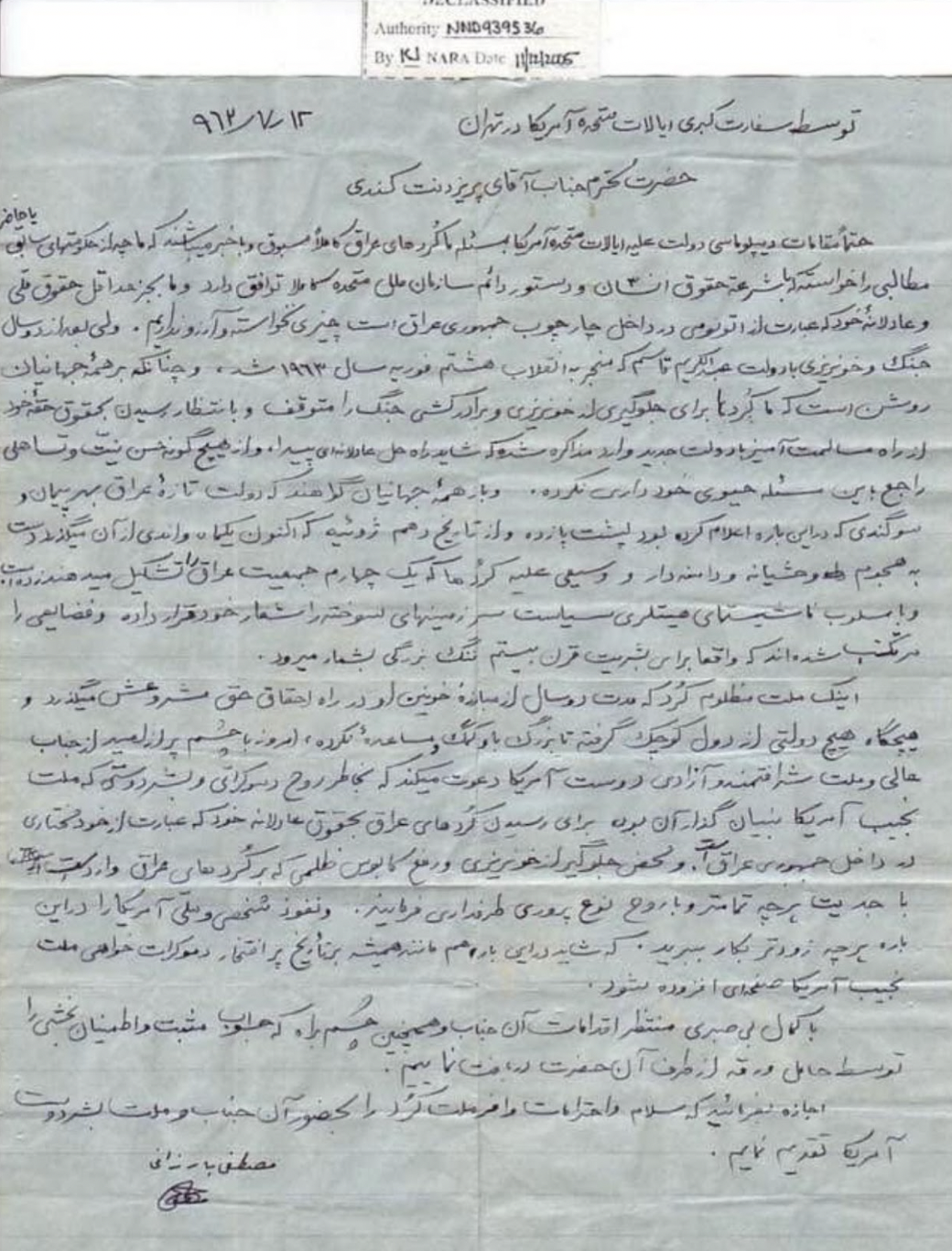 We are confident that the diplomatic officials of the United States of America are well aware of the case of our Kurdish nation in Iraq. We have repeatedly asked the former and current governments [of Iraq] for rights that align with the Universal Declaration of Human Rights and the Charter of the United Nations. We seek and wish for nothing more than our just and national right, which is autonomy within the government of Iraq. However, after two years of war and bloodshed with Abdul Karim Qassim’s government, which led to the revolution on February 8, 1963, and as it is clear to the world that we, the Kurds, have halted the violence to prevent bloodshed and civil war and have entered into peaceful dialogue with the new government of Iraq expecting that our legitimate rights will be secured. In this aim, we have spared no efforts to show our good will and facilitate the process.