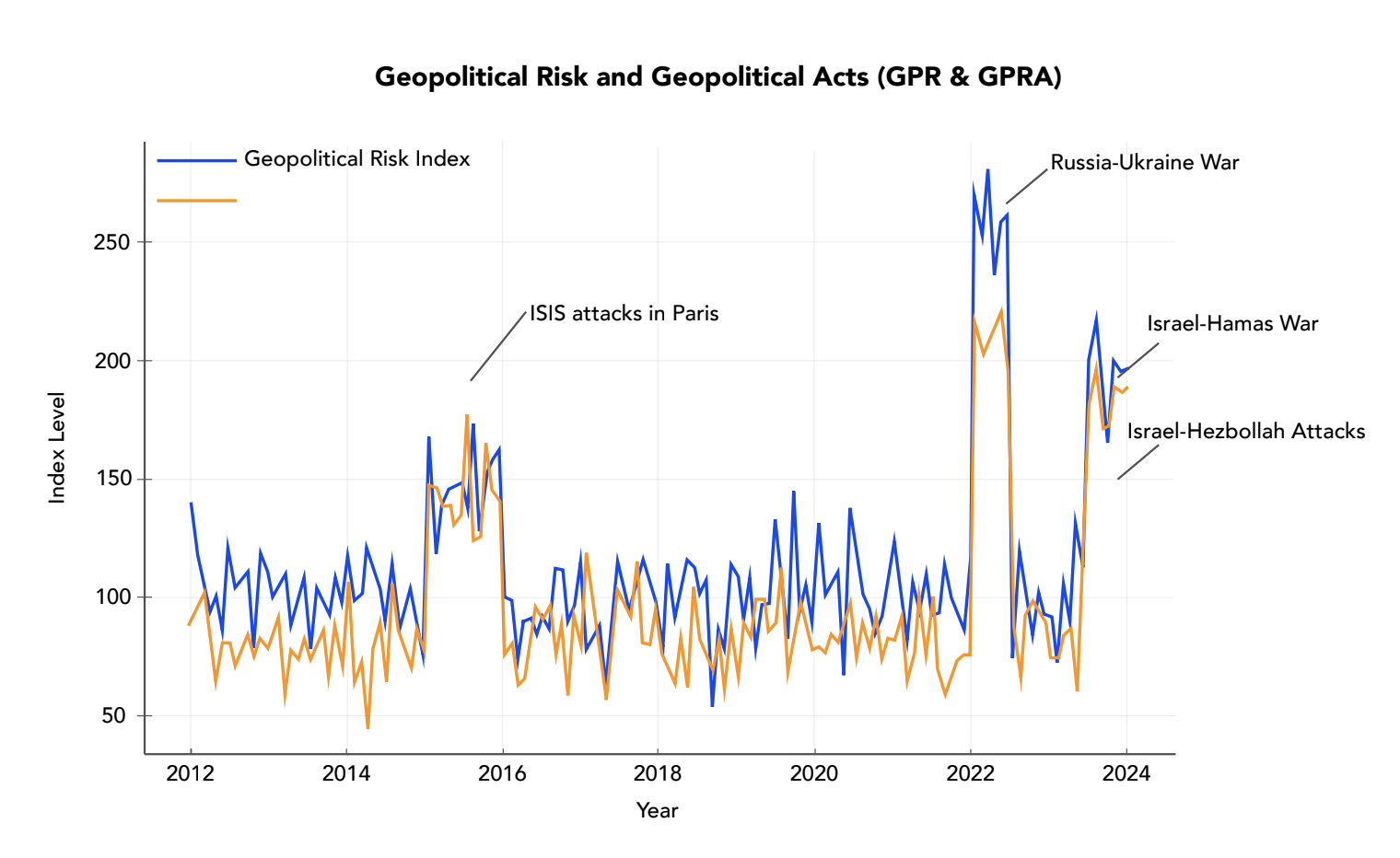 Geopolitical Risk (GPR) and War and Terror Acts (GPRA) indices have surged in recent years due to events such as the Russia-Ukraine war, the Israel-Hamas conflict, and attacks by non-state actors like Hezbollah. The three significant peaks in these indices, as illustrated in Figure 1, reflect pivotal geopolitical events that heightened global instability and risks. The first peak in 2015 corresponds to the ISIS-coordinated attacks in Paris, which sent shockwaves across the world and amplified fears of global terrorism, leading to a notable surge in both the GPR and GPRA. The second peak, observed in 2022, is tied to the outbreak of the Russia-Ukraine war. This conflict severely disrupted global energy markets and supply chains, significantly increasing geopolitical uncertainty and pushing the indices to new heights. The third major peak, from 2023 to 2024, is linked to escalating tensions in the Middle East, particularly the Israel-Hamas war in late 2023 and the subsequent Israel-Hezbollah conflict in 2024. These events underscored the region’s volatility and further intensified geopolitical risks, causing another sharp rise in both indices. During this period, the GPR increased by approximately 33.3%, while the GPRA rose by around 35.7%, reflecting the severe escalation of risk in the Middle East.