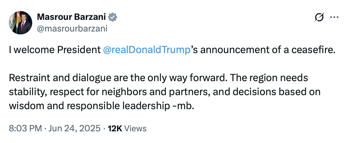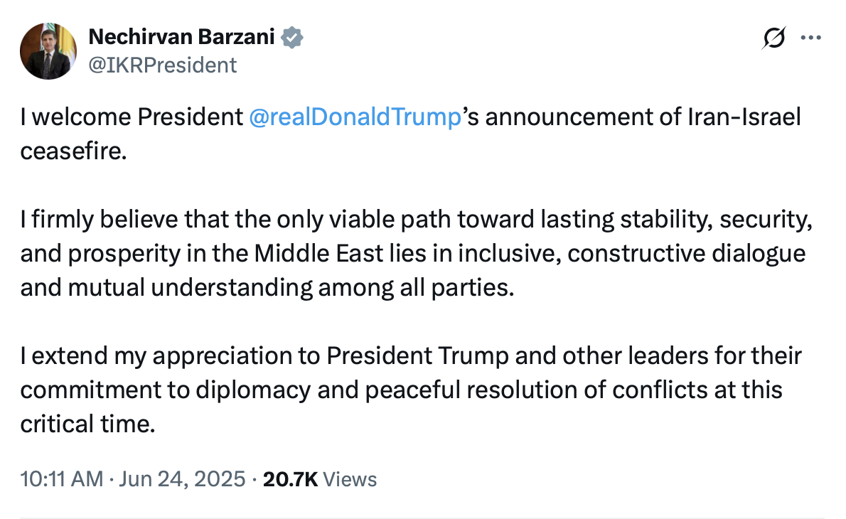 Kurdish leaders on Tuesday welcomed U.S. President Donald Trump’s announcement of a ceasefire between Israel and Iran.