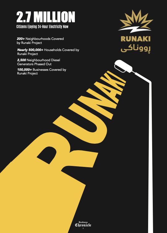 From 1991 until early in 2025, in the scorching summers and freezing winters, people in the Kurdistan Region had to struggle with the lack of electricity. In the absence of government-supplied power, neighborhood generators stepped in, offering limited voltage but unlimited noise and air pollution. This temporary fix remained in place for over three decades until the Kurdistan Regional Government (KRG) took a bold decision by launching the Runaki (Light) Project.