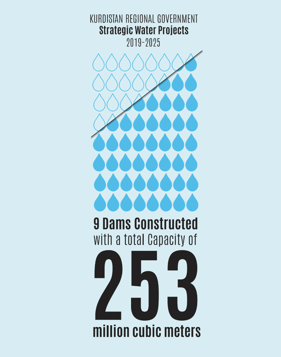 According to official reports, the KRG has constructed nine dams with a total reservoir capacity of 252.8 million cubic meters. In areas where dams are not feasible, the KRG has built 23 new water ponds, totaling 126 across the region.