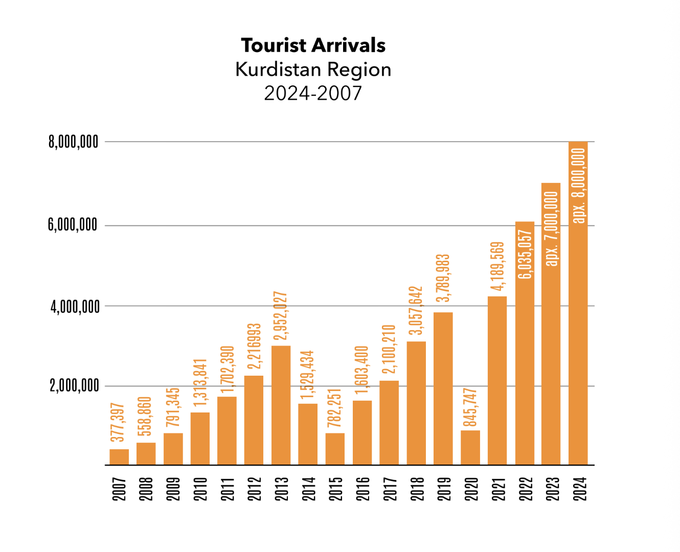 According to official statistics, only 377,000 tourists visited the Kurdistan Region in 2007, but this number has grown to 8 million in 2024, which is largely the result of the strategic attention that the regional government has paid to developing tourism projects.