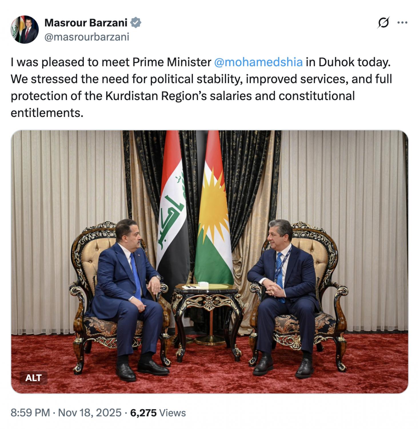 According to the KRG readout, during the meeting emphasis was placed on the importance of providing salaries and meeting the Kurdistan Region’s financial entitlements. The September salaries for public servants in the Kurdistan Region remain undelivered.
