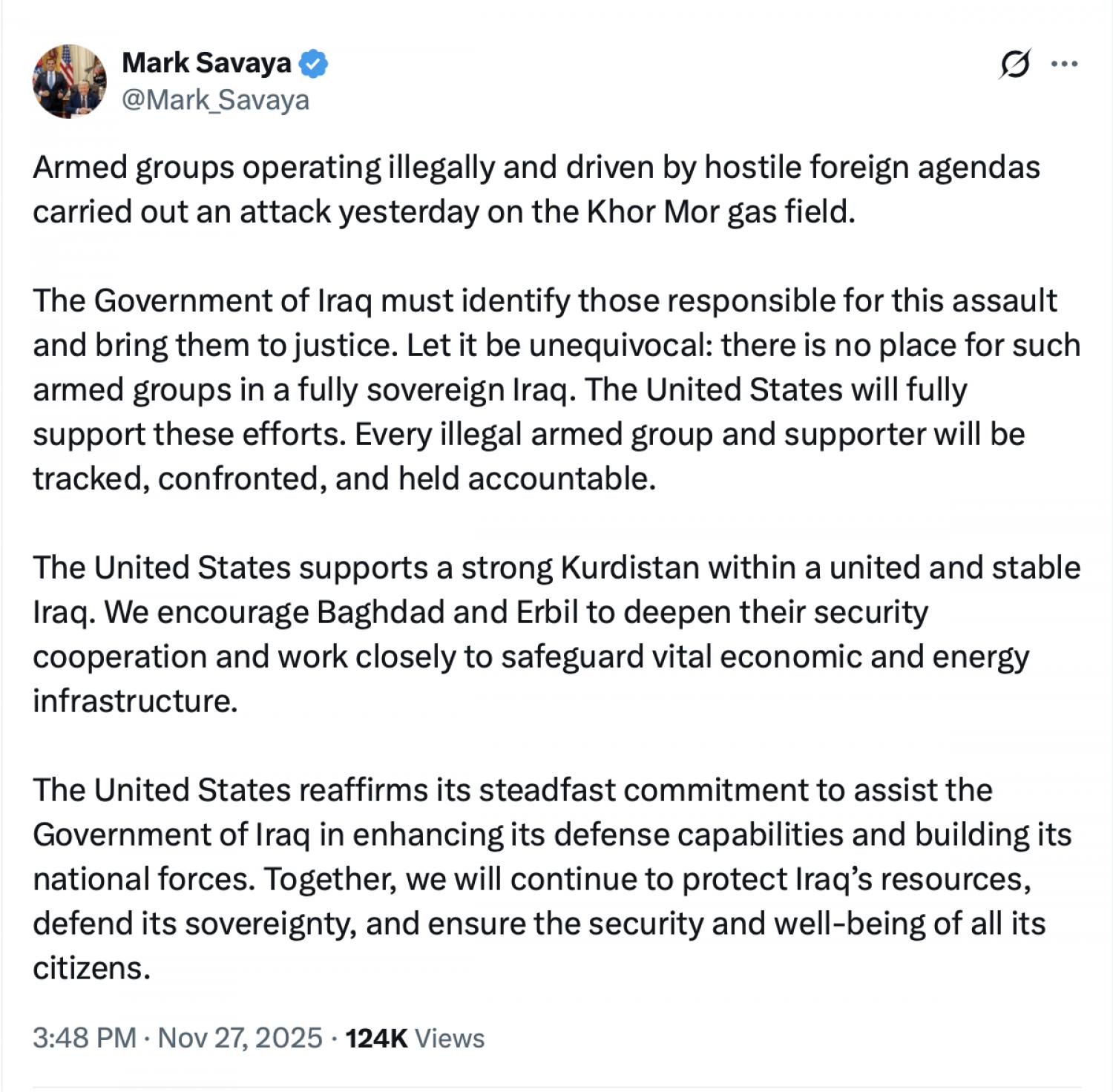 The U.S. Special Envoy to Iraq Mark Savaya in a post on X on Thursday underlined that “armed groups operating illegally and driven by hostile foreign agendas carried out an attack yesterday on the Khor Mor gas field.