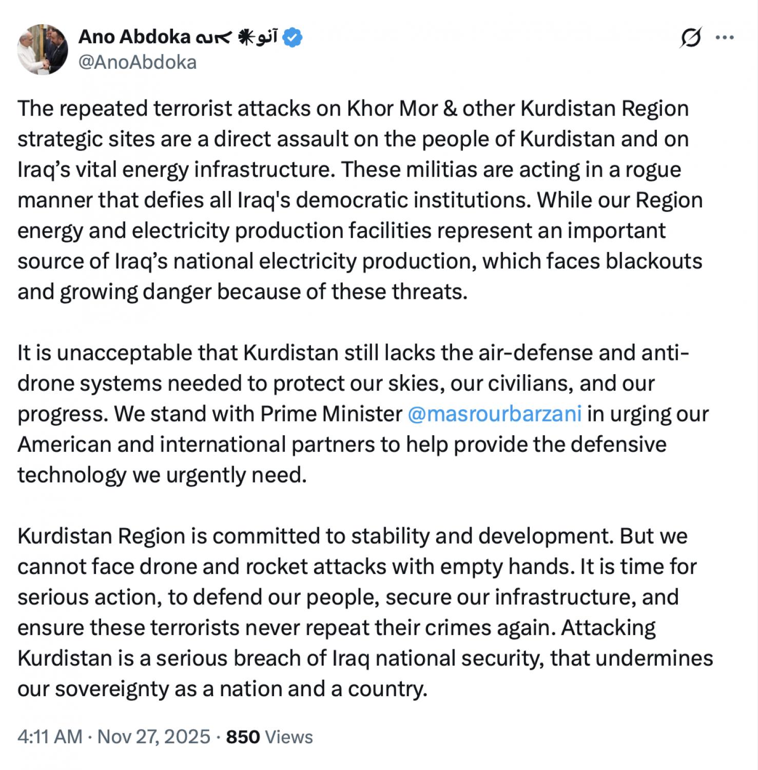 Furthermore, Ano Jawhar Abdulmaseeh Abdoka, KRG Minister of Transport and Communications, in a post on X underlined that these “terrorist attacks on Khor Mor and other Kurdistan Region strategic sites are a direct assault on the people of Kurdistan and on Iraq’s vital energy infrastructure.