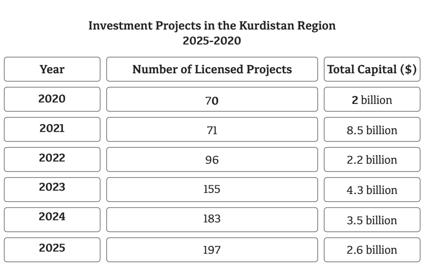 The past five years have tested economies worldwide. Despite global shocks and regional uncertainty, the investment climate in the Kurdistan Region has remained strong, maintaining steady growth momentum. Since 2020, the Kurdistan Board of Investment has continued to license hundreds of new projects, reflecting sustained investor confidence.